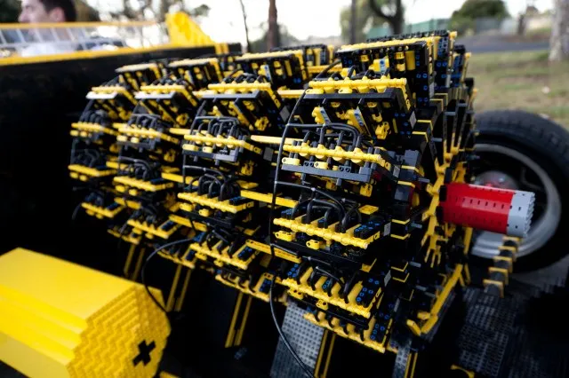 Even the engine appears to be built entirely out of Legos. Sporting 64 cylinders (4 banks of 16 cylinders,) the radial design locates the pistons in a circle around the crankshaft, like what airplanes use. What isn’t fully disclosed is this motor is powered by air and if you look closely at the video you can see an air compressor cloaked with Legos.