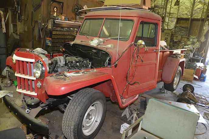Also tucked away in the shop was a 50’s model Willys Jeep truck. This little pickup had also received an LS transplant, some aftermarket gauges and other freshening. This one looked a little closer to completion, but again we didn’t have time to inquire about everything.