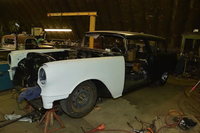 We didn’t get a ton of details from Pilkton on these two builds. What we can tell you is the Pontiac is a mid fifties Safari wagon. As is the case with nearly everything built at Dean’s, it’s getting updated with modern suspension and powertrain. There was a donor LS1 engine already under the hood. When we first arrived at the shop Pilkton was inside the car’s dog house doing some welding. This project looks to have a long way yet to go, we’ll keep you posted as it nears completion.