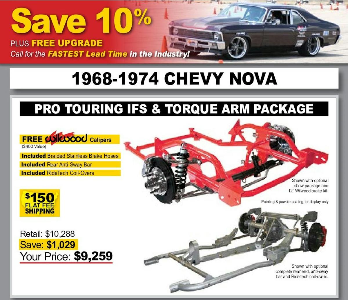 Through the end of January 2021, when you take the plunge and order TCI’s Pro-Touring IFS and Torque Arm package for your 1968-74 Nova, you’ll get many upgrades for free. To start, TCI will sweeten the deal with a red or black caliper upgrade from Wilwood, braided steel brake hoses, sway bar, and adjustable RideTech coil-overs for the rear suspension. Then, take another 10% off the total bill and get cheap freight costs of just 150.00.