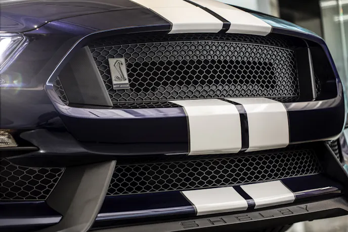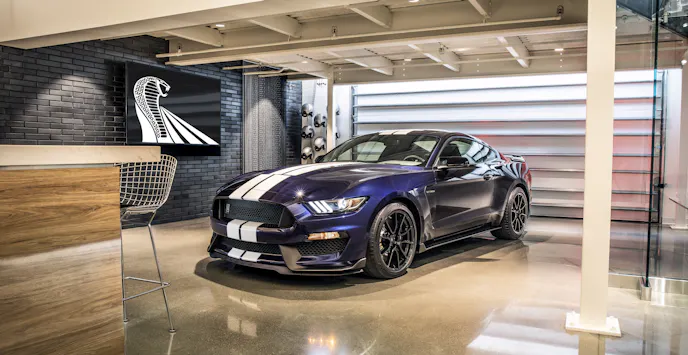 Inside the GT350, drivers enjoy a purpose-built cockpit with aluminum and carbon fiber accents. Recaro race seats with firm side bolstering and open pass-throughs for safety harnesses are standard, and color options include Velocity Blue and for the first time, Ford Performance Blue. Optional factory-painted over-the-top racing stripes are available in high-gloss Shadow Black, Oxford White or Kona Blue. Mirror-mounted Shelby Cobra Projection Lamps come standard in the available Technology Package.
