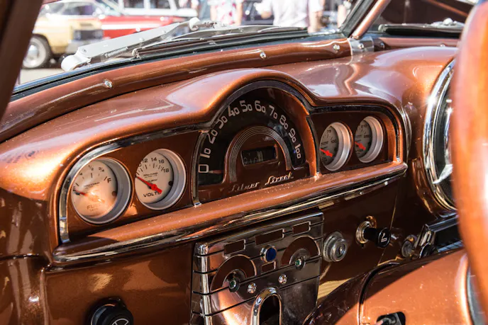 With the updated drivetrain and show-quality interior, of course the instruments had to be upgraded to match. The dash now features a nice set of Auto-Meter gauges and an Auto-Meter tachometer where the clock would have been in the center of the speaker. He has also added a newer stereo and air conditioning to make the ride a little more comfortable.