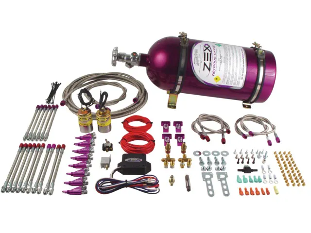 ZEX Direct Port 640These are complete, easy-to-install direct port nitrous system for any V8 EFI engine. The kits add 75-300 horsepower, use ZEX’s patented self-adjusting injector nozzles, and activate nitrous at wide open throttle using the company’s patented throttle position sensor switch technology. The kits use distribution flex lines that make for an easy fit on your intake manifold, meaning there is no time wasted on bending and cutting hard lines. Each kit includes a 10-pound nitrous bottle, brackets, nitrous and fuel solenoids, an electronic throttle activation switch and all plumbing and electrical connectors.