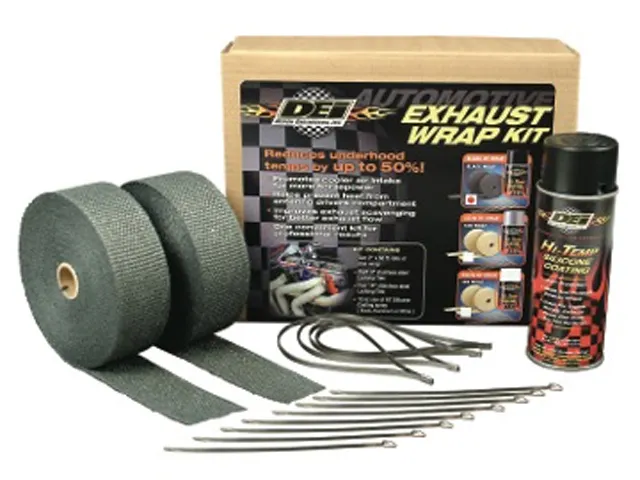 deiwrapAn important first step in reducing unwanted and power-robbing under hood heat is wrapping exhaust headers and downpipes. Less under hood radiant heat results in a cooler air charge for improved performance. Design Engineering offers an all-in-one kit for wrapping a set of headers or motorcycle pipes. The automotive kit includes (2) 2-inch x 50 ft  rolls of exhaust wrap (Motorcycle kit: (2) rolls of 2-inch x 15 ft), one can of HT silicone coating & locking ties. Available in Black wrap with black HT spray, tan wrap with white HT spray, and tan wrap with silver HT spray.