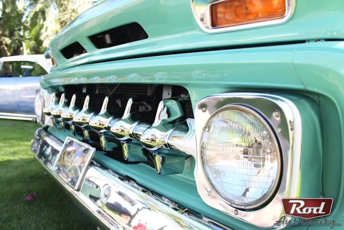 Along with some extensive weld work other kustom touches include a ’53 Chevy grille swap and bullet caps mated to ’59 Dodge Lancer hubcaps. Ken laid sea foam green on the body, which was the truck’s stock color, only he had mixed in some white to subdue the tone. A Route 66 emblem sits like a medal of honor on the dash in commemoration of Ken’s completion of the travel route. We asked him, “So you drive this thing hard?” Ken replied, “O yeah, that’s what it’s for.”