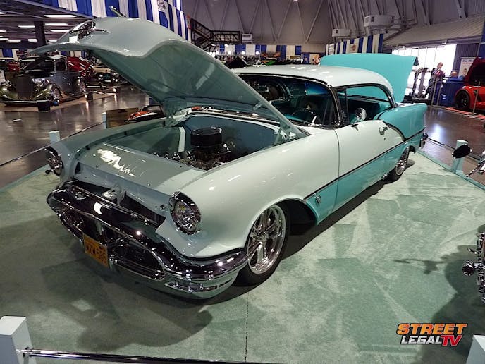 Not all muscle was built in the Sixties and this little ’56 Olds 88 really knocked us out. Running a 600 HP 455ci big-block, Fatman frame, Wilwood brakes and one off Foose wheels, it combined timeless GM styling and resto touches very nicely. We like that all the factory trim and emblems were retained. The two-tone Crest toothpaste blue green was a refreshingly different color combo.