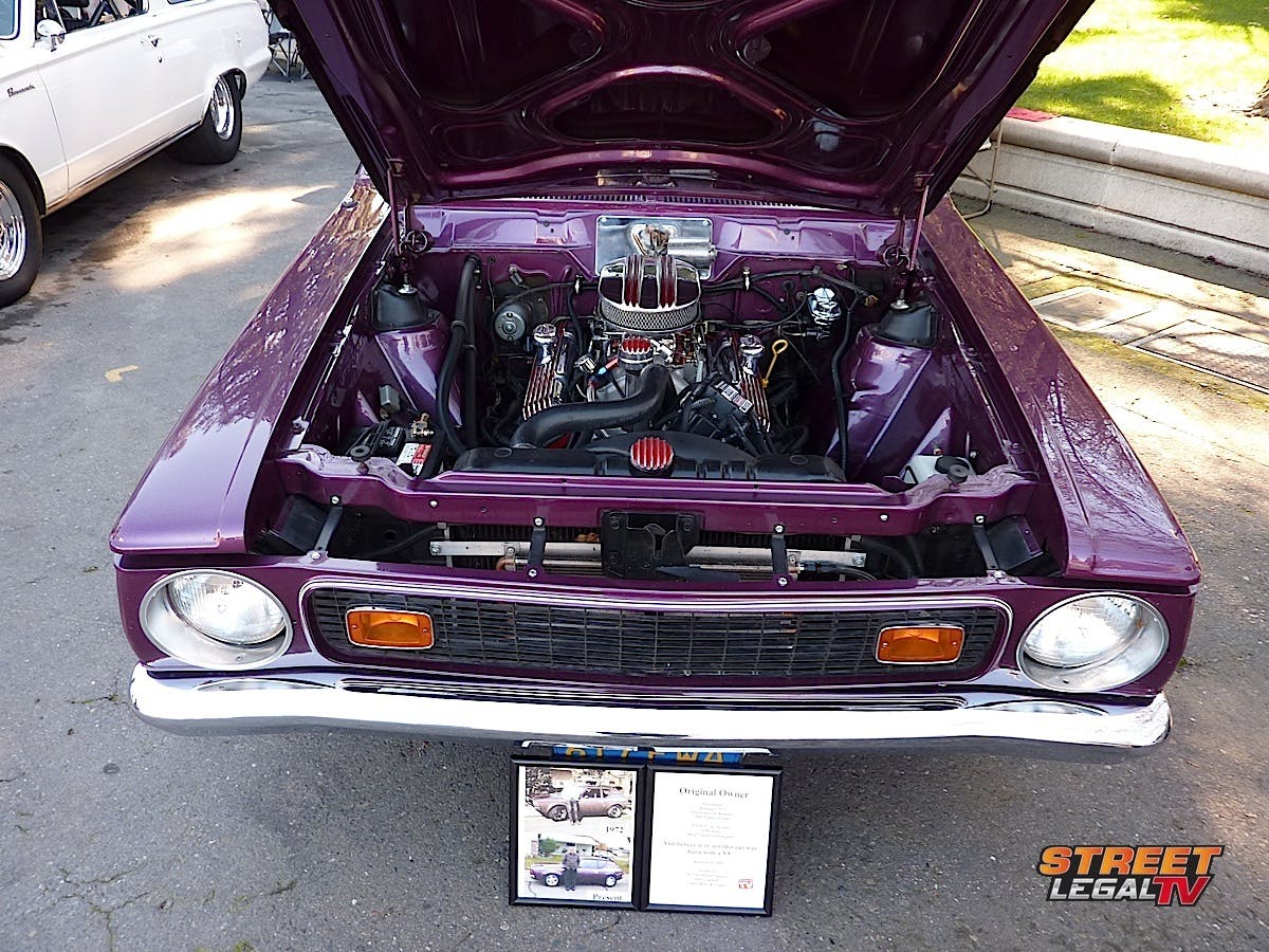 In a sea of Tri-5 Chevys, Camaros, and ’32 Fords, we thought it might be time to clear the palette. We’re suckers for orphans and oddballs and this little purple Gremlin X was a hidden gem parked at the “Drive In” outside. One owner since new, it sparkled in AMC purple with white stripes. The little 301ci V-8 looked slightly warmed up and the mags were a nice finishing touch. This lightweight, chopped down Hornet probably has some stink as the V8 doesn’t have much weight to move off the line. You can almost hear “Freebird” wafting out of the interior.