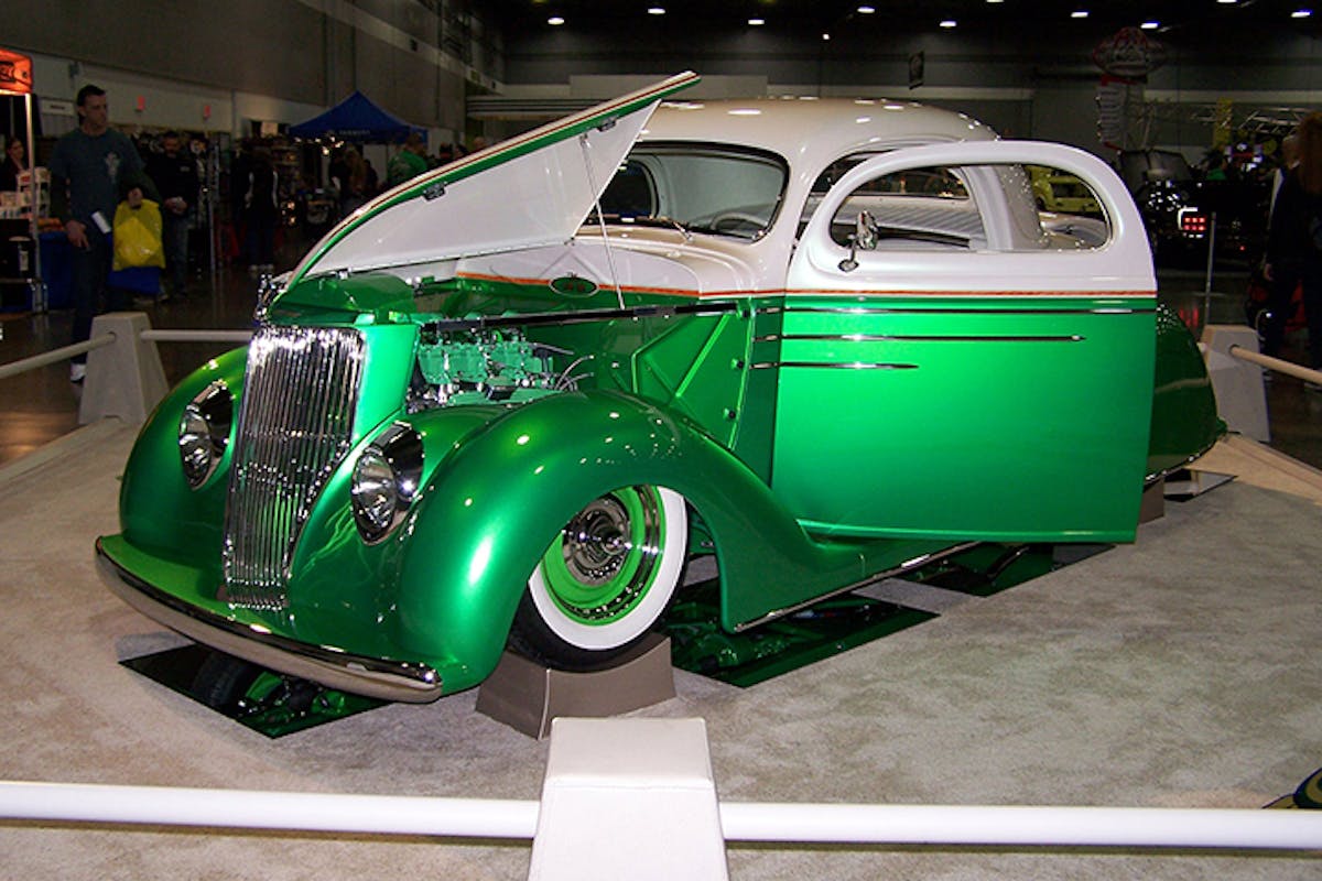 Herb Sutton’s all-steel, radical ’36 Ford three-window coupe, ‘So Lo’, was built by Carrs Rods & Customs, resplendent in its House Of Kolor‘s Candy Lime and White Pearl livery.