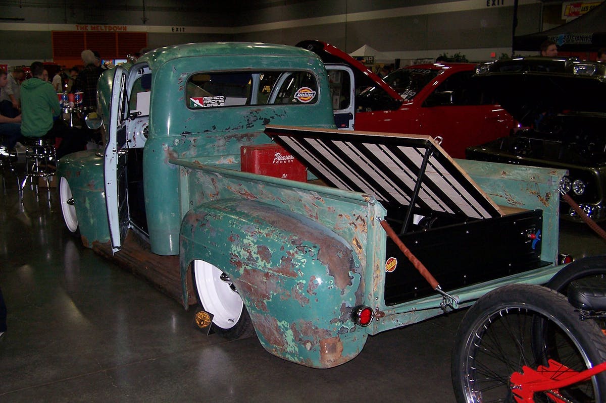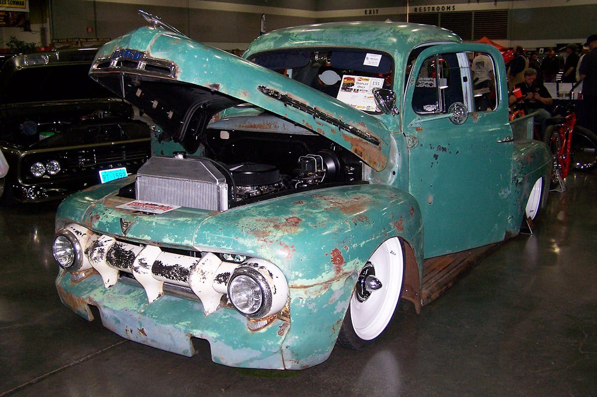 Chris Church’s ’52 Ford F-1 uses a SBC, Detroit Steel wheels, Lokar shifter, quick release steering wheel, Dickies workwear fabric-covered seat covers and trim panels, and recoated aircraft seat belt latches. However, Church didn’t say whether he plans to paint it or not.
