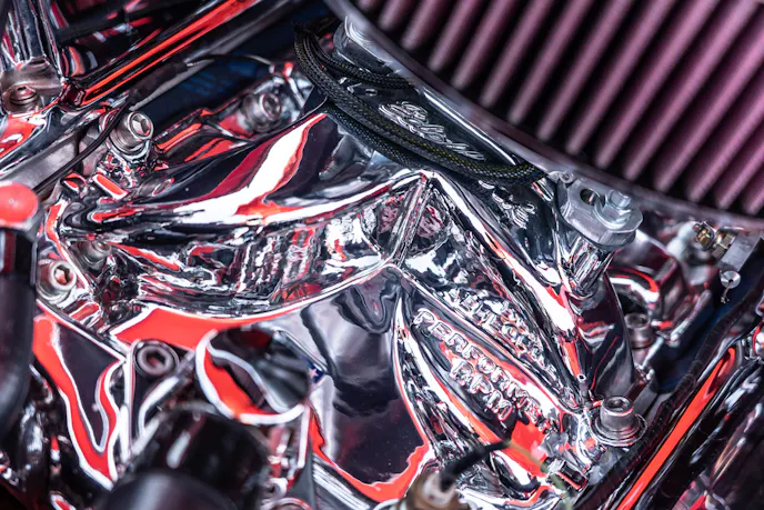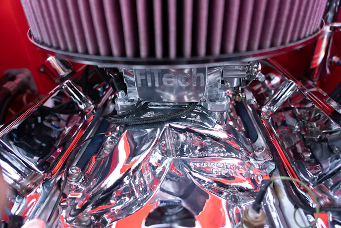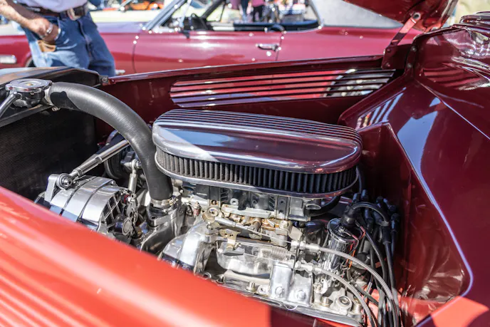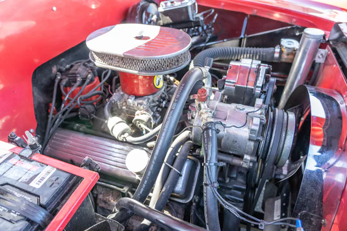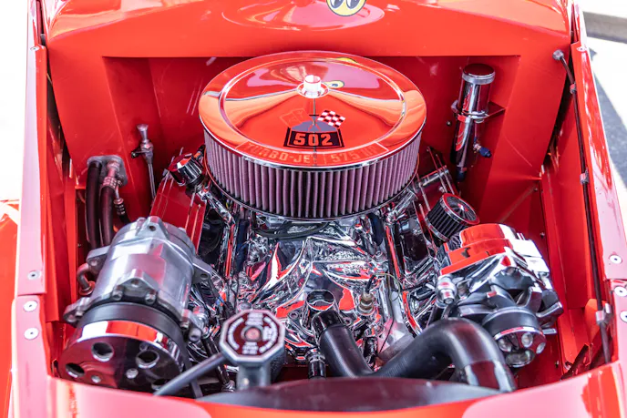 That 502 cubic-incher barely fits under the hood of this red-hot beauty.