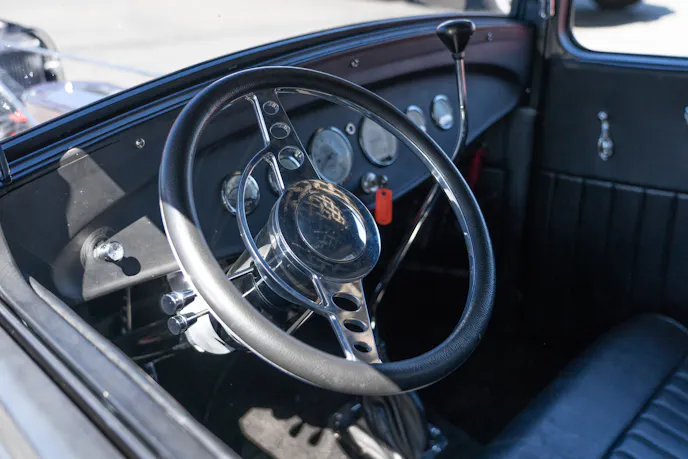 The upholstery is a really unique custom touch that highlights the classic hot rodding heritage of the build. When Fred was getting ready to have the upholstery done he was looking through an upholstery sample book and this really struck a chord. Not only is it a nice canvas that keeps cool on the hot days and doesn’t freeze when it’s cold, but the color scheme goes well with the exterior also and it’s just another reason why we love this build.