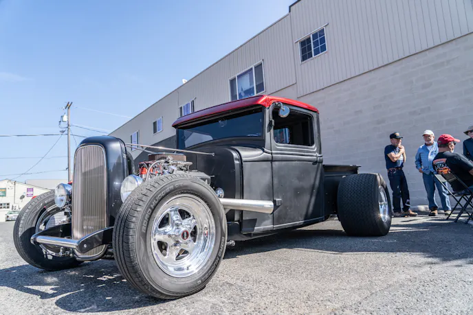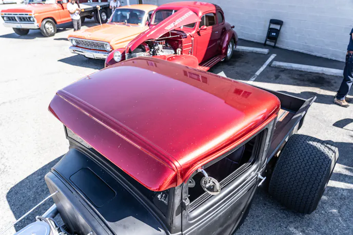 We love the look of some really fat tires on either side of the bed of a hotrod pickup like this. The primer black paint on the body and stunning candy-apple red on the roof really make this build stand out. We talked to the owner, Dick Tames of Sequim, Washington, and he filled us in on the finer details of his wicked hotrod.
