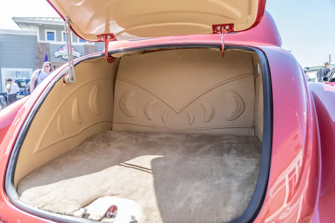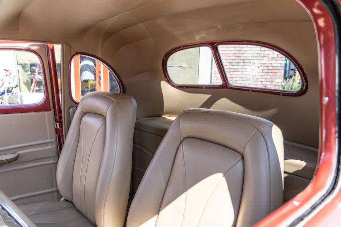 The improvements don’t simply stop at the undercarriage however and follow onto the exterior and interior. The body has been treated to the full shave and fill treatment for the ultimate smoothed look, the bumpers have been removed, and all the seems have been filled. The two-piece windshield has been replaced for a Clacks 1-piece windshield, the rear fender has been molded to the body, and a third flush-fit LED brake light was added. The interior features a ’40 Ford dash, VDO gauges, Weld steering wheel, a tilt column, and all custom leather upholstery by Rick Gentry that goes all the way into the trunk!