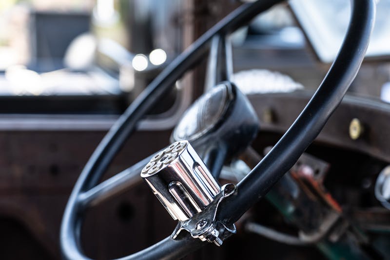 The interior is a unique custom style that matches the rest of the build perfectly. The seat is a single bench out of an old school bus with the steering wheel strategically mounted in the center of the cab.