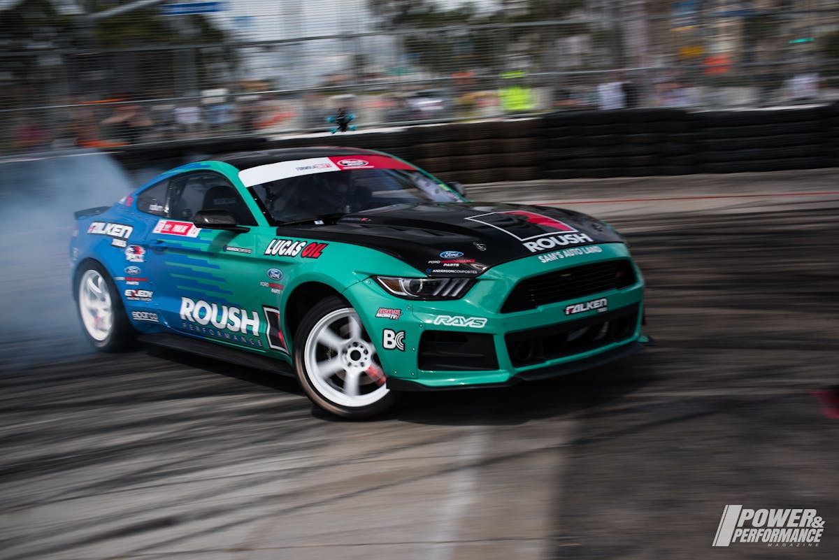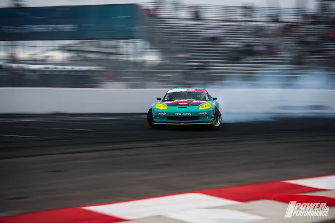 Moving onto the Great 8, Bakchis went head-to-head with Justin “JTP” Pawlak in the Roush Performance Ford Mustang. Wrapped in identical Falken team colors, both drivers explored the track limits as they brushed from wall-to-wall in a perfect demonstration of drifting art. After two runs the judges were unable to separate them so called for “One More Time.”