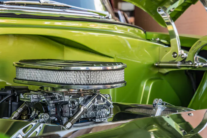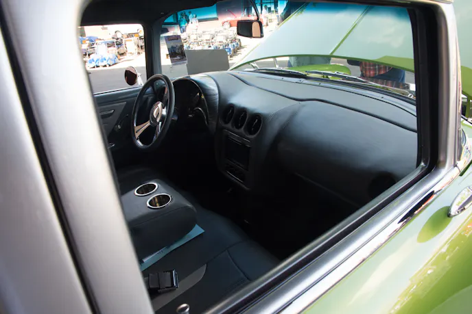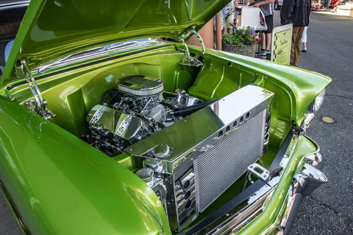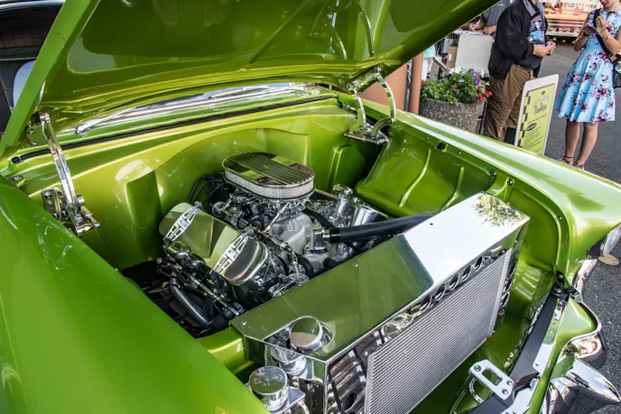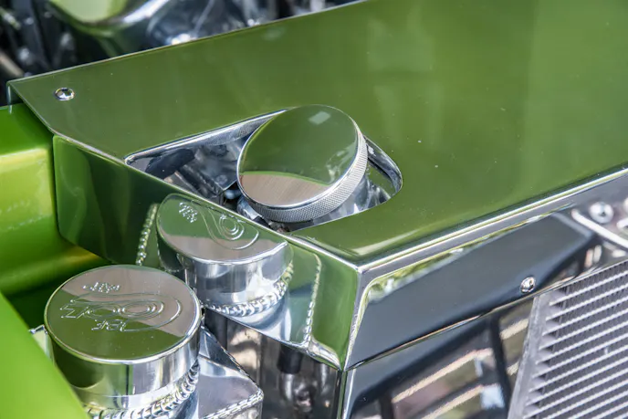 This car immediately caught our eye as we were walking around the event. It’s green paint and slightly different proportions made it stand out. We got closer, saw the gleaming chrome under the hood, and knew we were going to have to find out more.