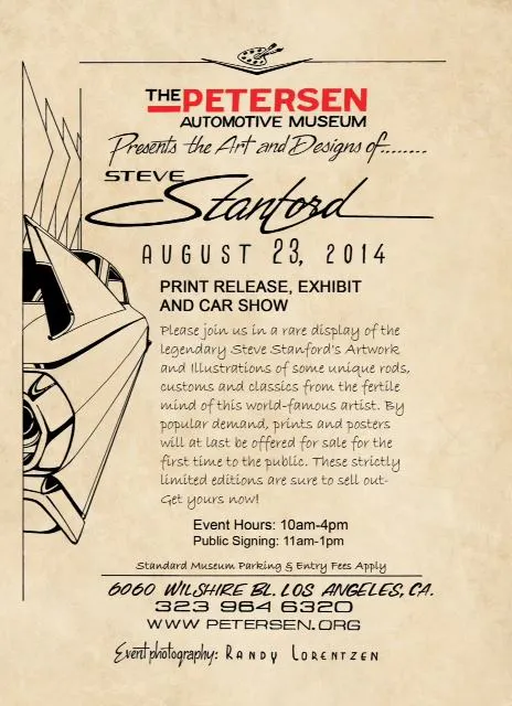Recently, Rod Authority got the chance to attend an amazing event. On August 23rd, 2014, Petersen Museum in Los Angeles, California hosted an exhibit completely devoted to automotive artist Steve Stanford. Steve Stanford is quite easily one of the world’s foremost automotive artists and designers. Stanford has given life to countless pieces of art that are more akin to children to him. Each and every single piece gets an emotional response, a passion and vision that pours out onto the page and is very precious to him.