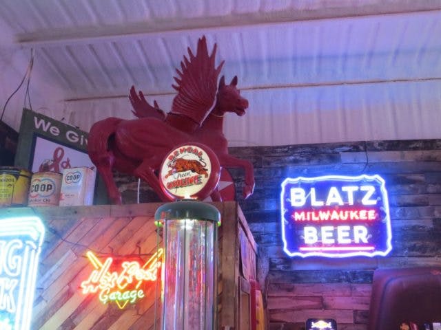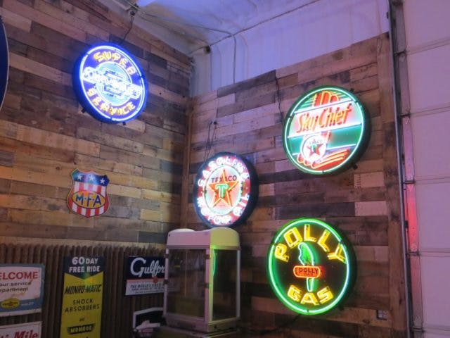 If that doesn’t qualify as big, then the rest of the parking lot of Cook’s Garage will, as plans are to pave the remaining area to the east. That will add several hundred more parking spaces, just in time for their First Annual as-yet-to-be-named open rod run/show to be held in September. The oil company signs are unique, but even better are the collectible neon signs and other porcelain signs inside the restaurant and bar.