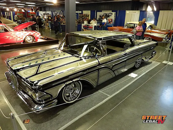 Many kustom delights lurk in the Cal Expo halls and sometimes you find a diamond displayed in an inconspicuous spot. Check out Bruce VanEtten’s 1959 Edsel Ranger two-door hardtop tucked away on a lower level, far away from the Celebrity Kustoms vortex. This has to be the most audacious paneled paint job on record. Think Larry Watson on acid and you get the drift.
