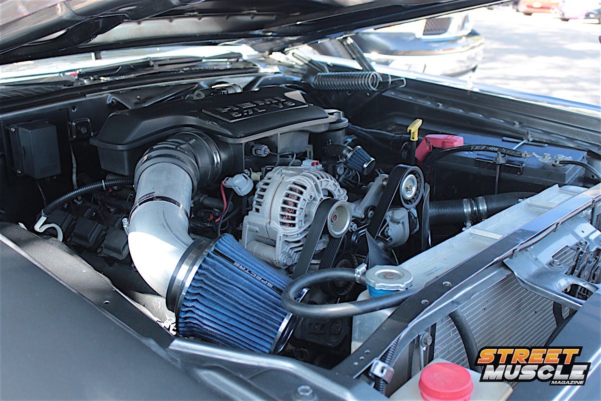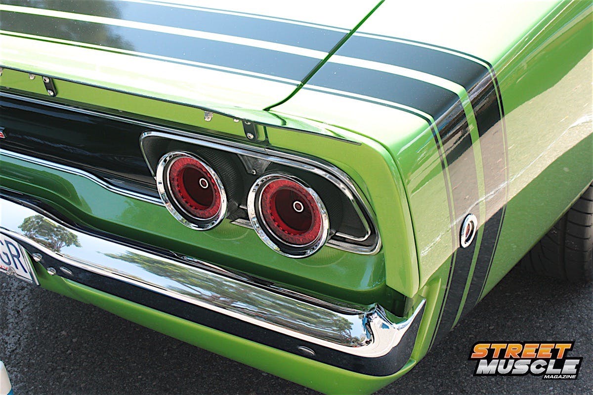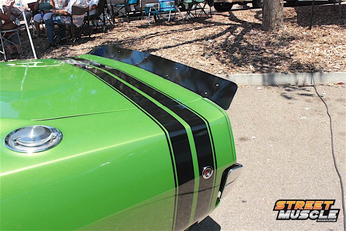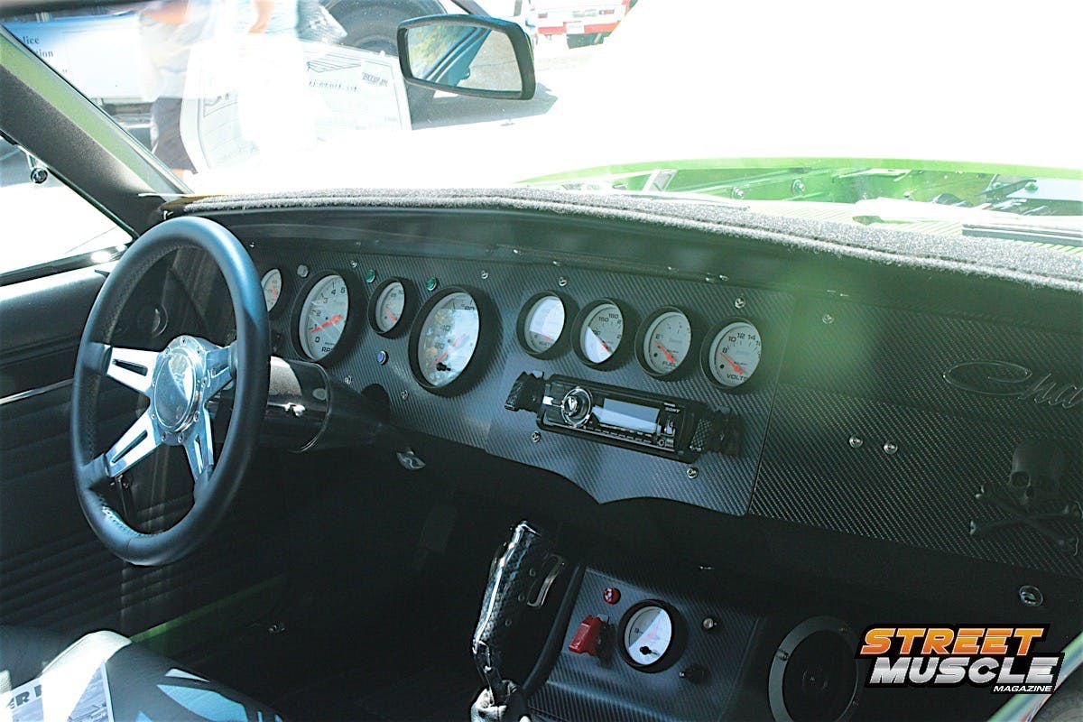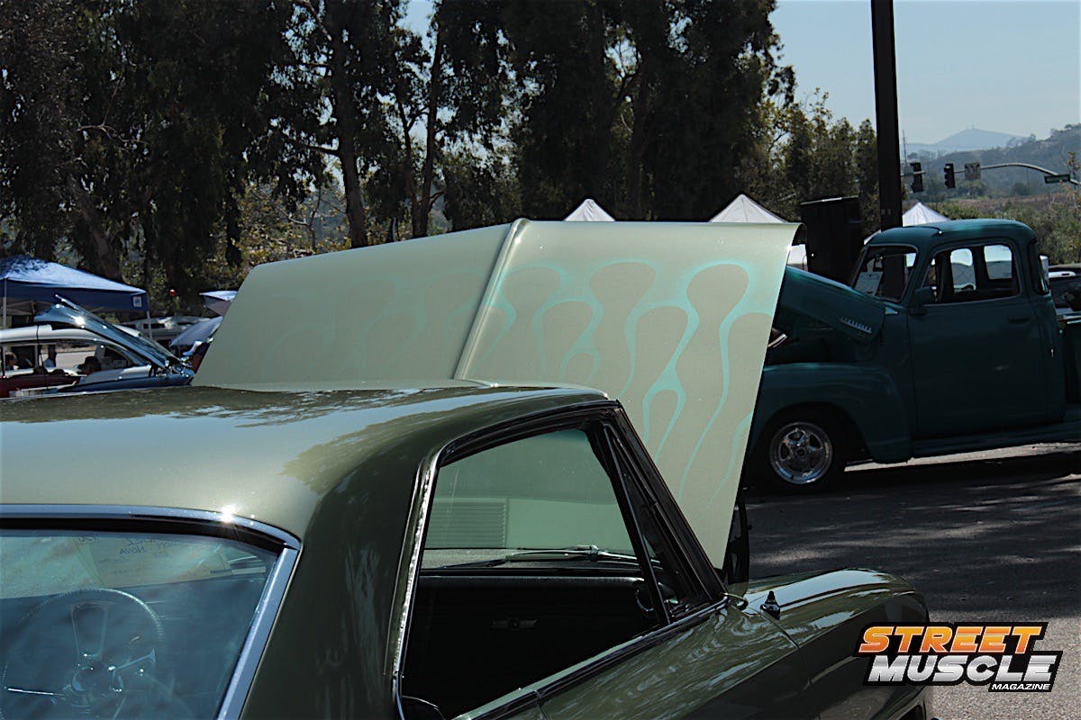 Owner Ray Garner has custom touches all around the car, including spoilers, modern emblems, and carbon fiber panels in the interior and engine bay. If the bright green color didn’t get you, there was something else that drew people in.
