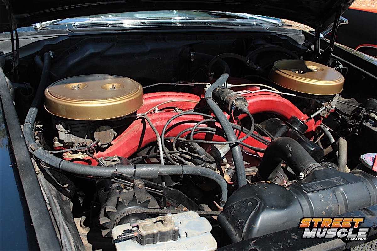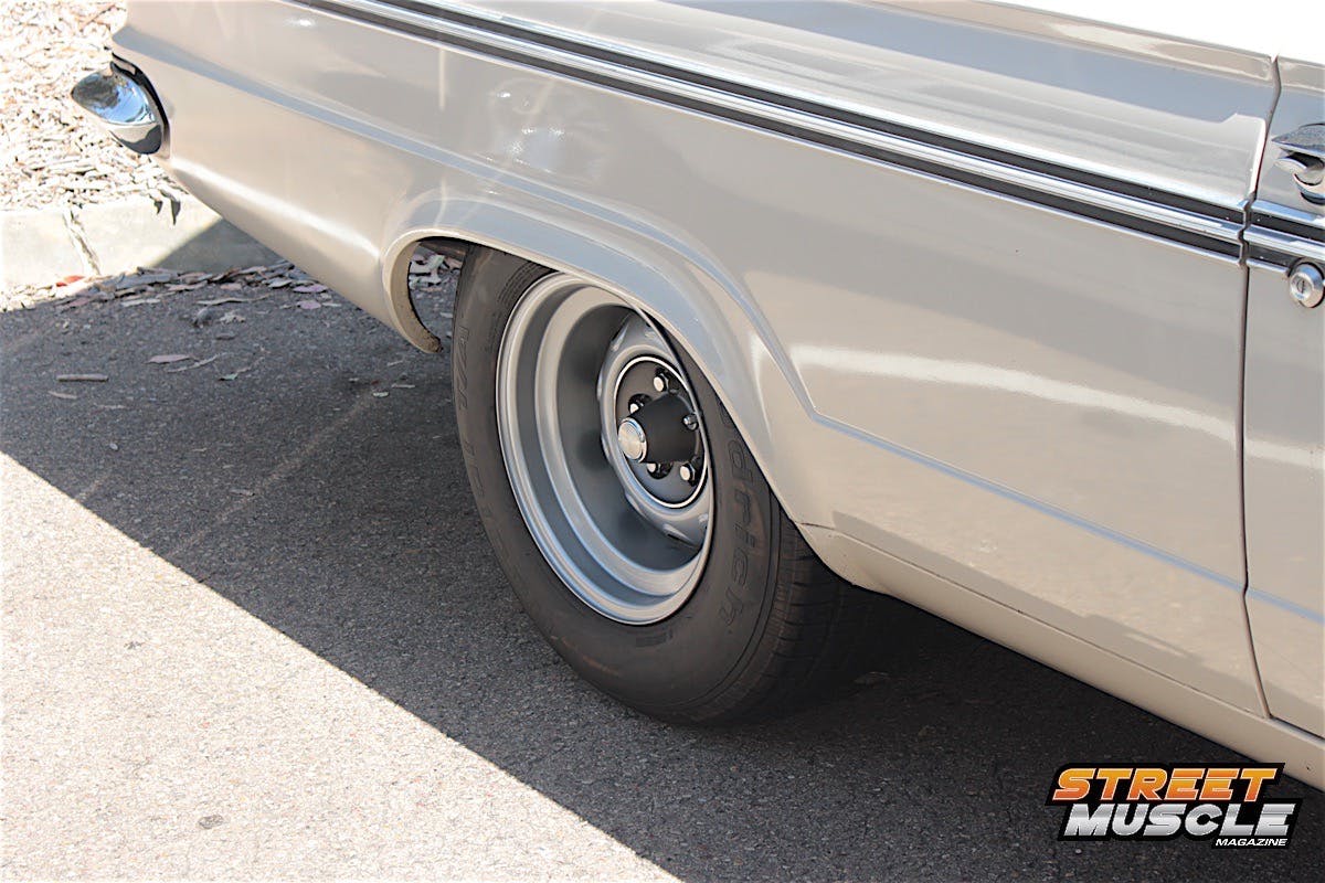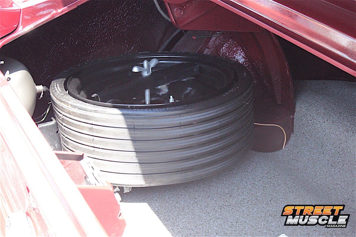 Behind that behemoth powerplant is a four-speed transmission, and all that power reaches the ground on Goodyear Polyglass GT tires in a modest G60-15 sizing. Do you remember when we ordered our tires by letter code, width ratio, and rim size?