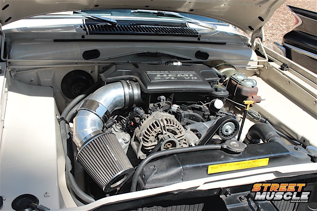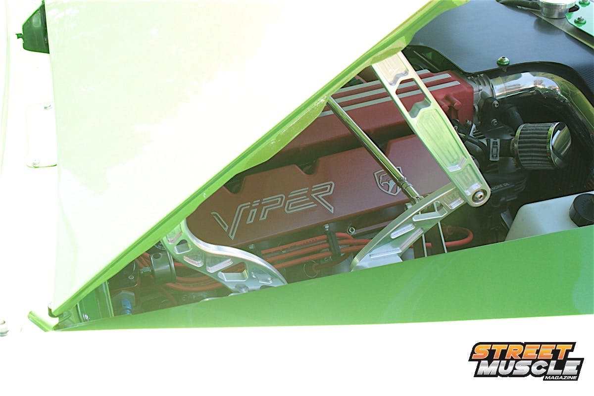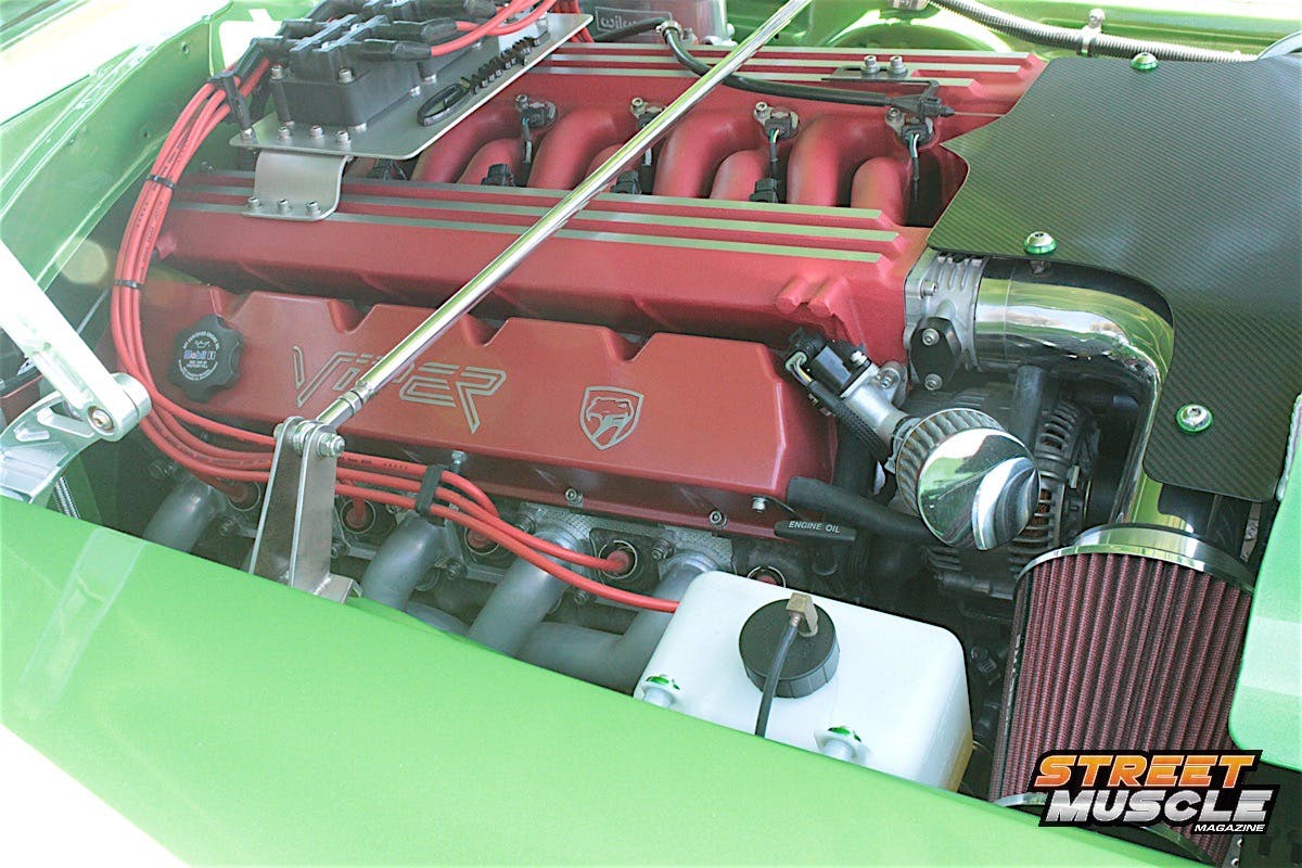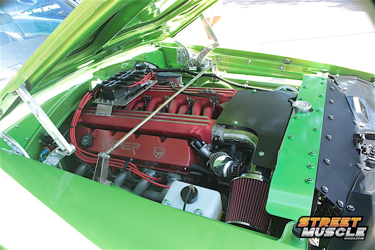 The one item that just jumped right out at us was the additional pair of cylinders filling the engine bay. When you see red under the hood of a Mopar in the form of long, flowing runners, you can be sure that a Dodge Viper gave it’s heart and soul to this match made in Mopar Heaven.