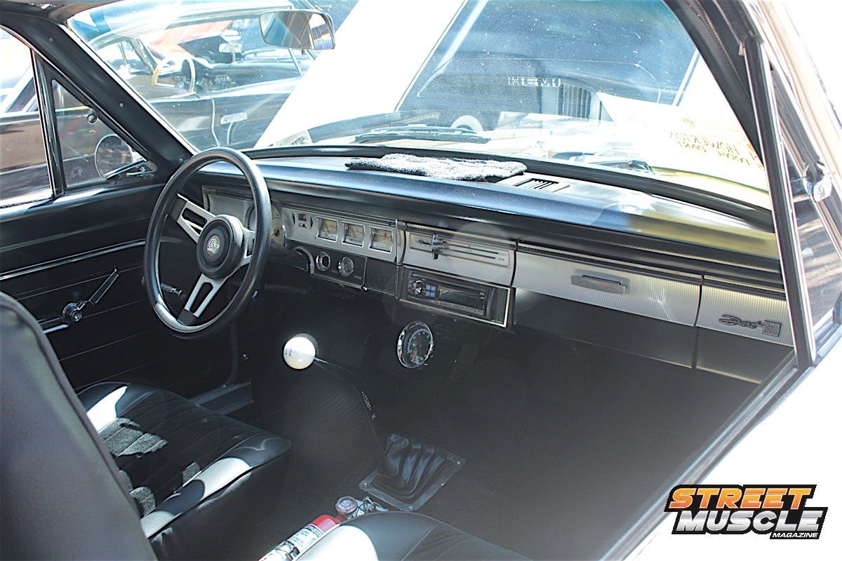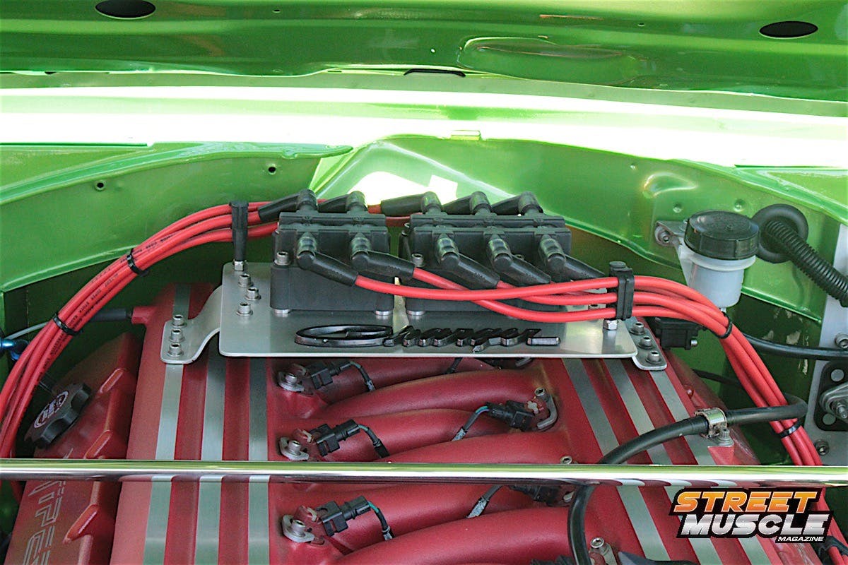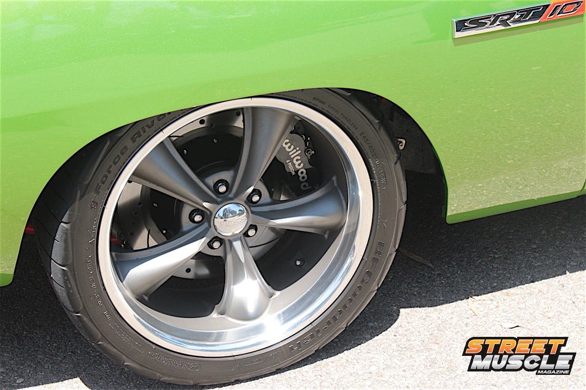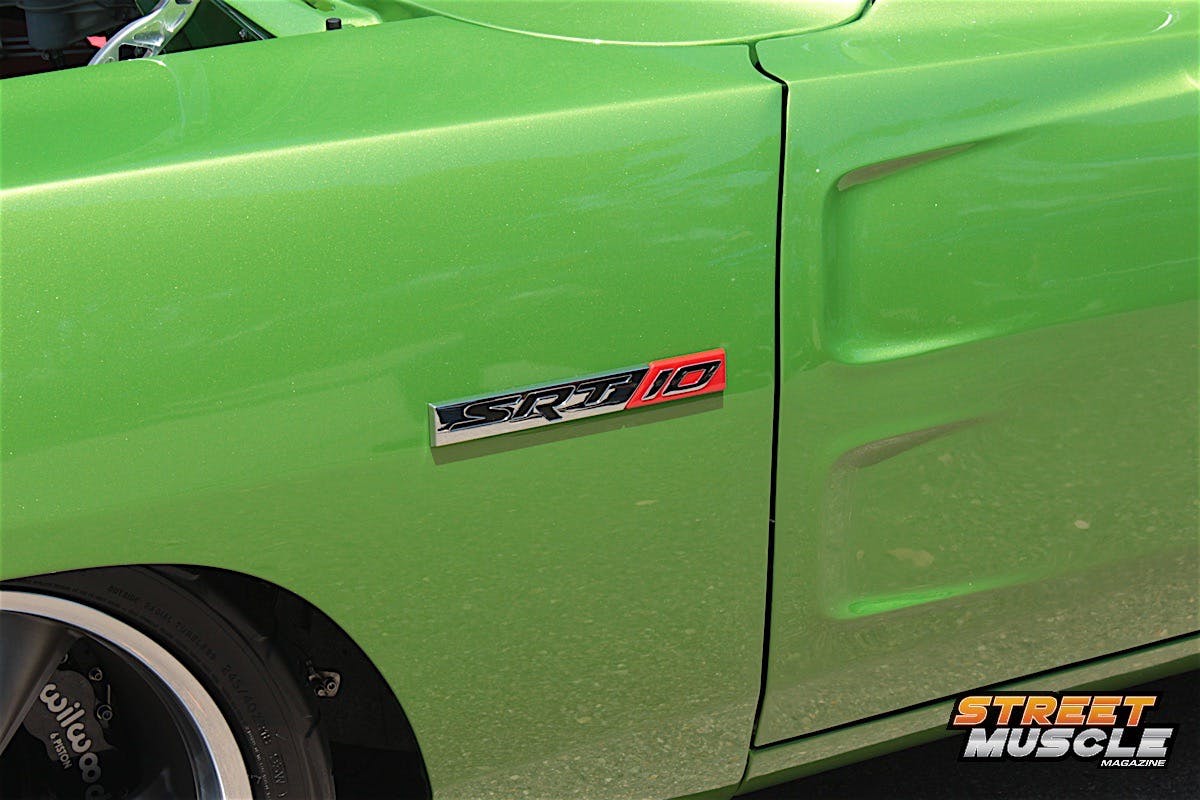 Slowing the beast is a set of Wilwood multi-piston calipers, with 18-inch wheels wrapped in 245/45 and 285/40 rubber front and rear. Even with the hood closed, you couldn’t miss the multiple cues as to what powers this B-body. SRT-10 emblems are used on the fenders and rear of the car, and even under the hood.