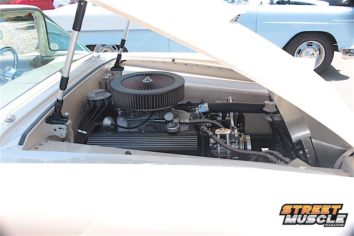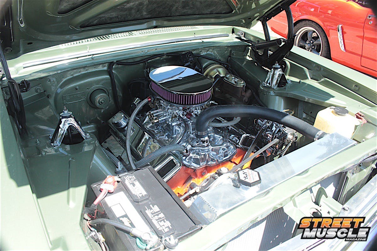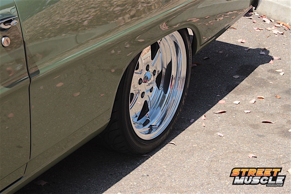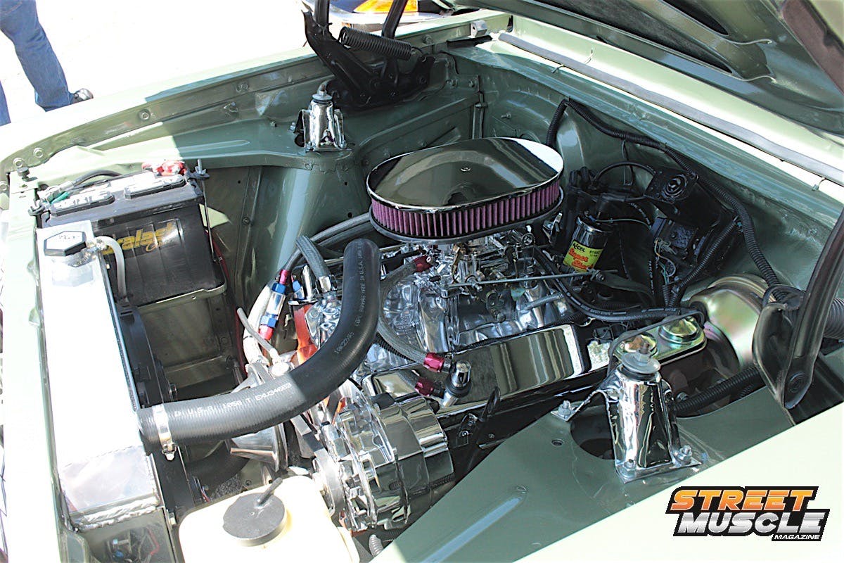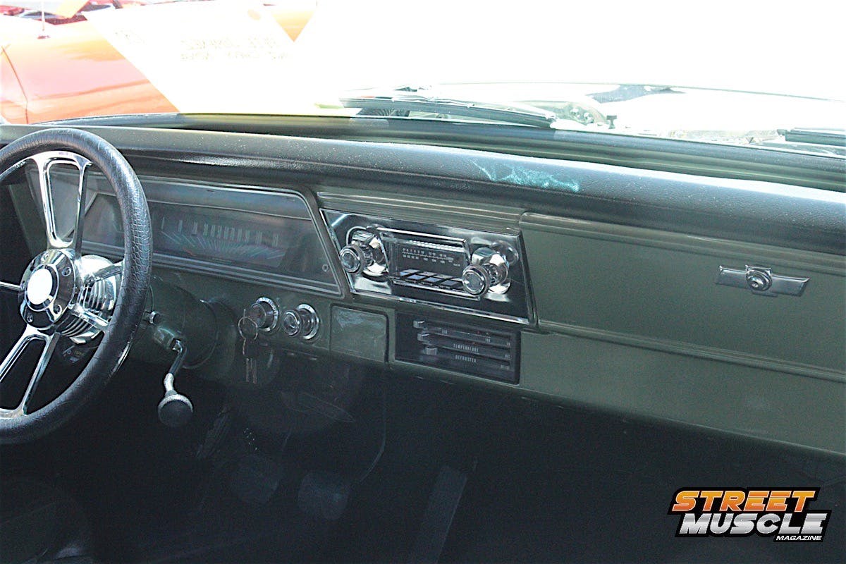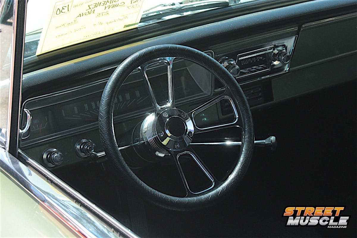 The spartan dash is highlighted by a custom billet steering wheel and a period-style radio with not much else to look at, save for the sliding controls for the ventilation. We’d say when it comes to cookie-cutter Novas, Pete colored outside the lines a little with this one.