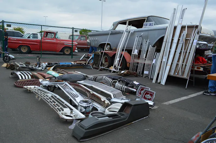 Dozens of individuals hawked their wares– from classic car parts and vintage truck tailgates to hard-to-find vintage badges and trim. Even vintage car toys were on display for interested buyers. Those looking for more substantial projects browsed the rows of vehicles for sale, which included everything from rusty shells to rolling chassis with plenty of body work already put into the vehicles.