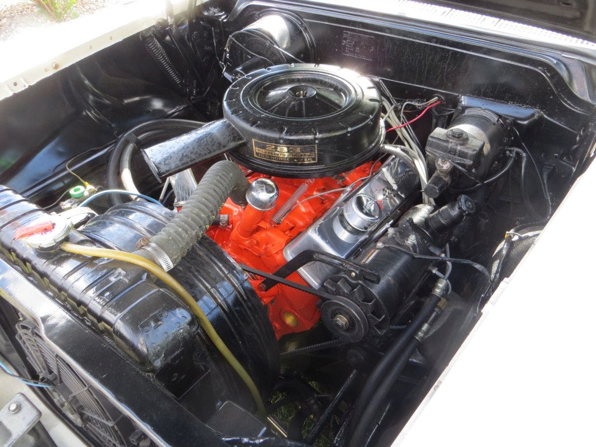 The car rolls on wide whitewalls and stock ’58 hubcaps with the optional three-bar spinners added. The pair of fifties icons – dual antennas are factory stock and it doesn’t get much more original than that.