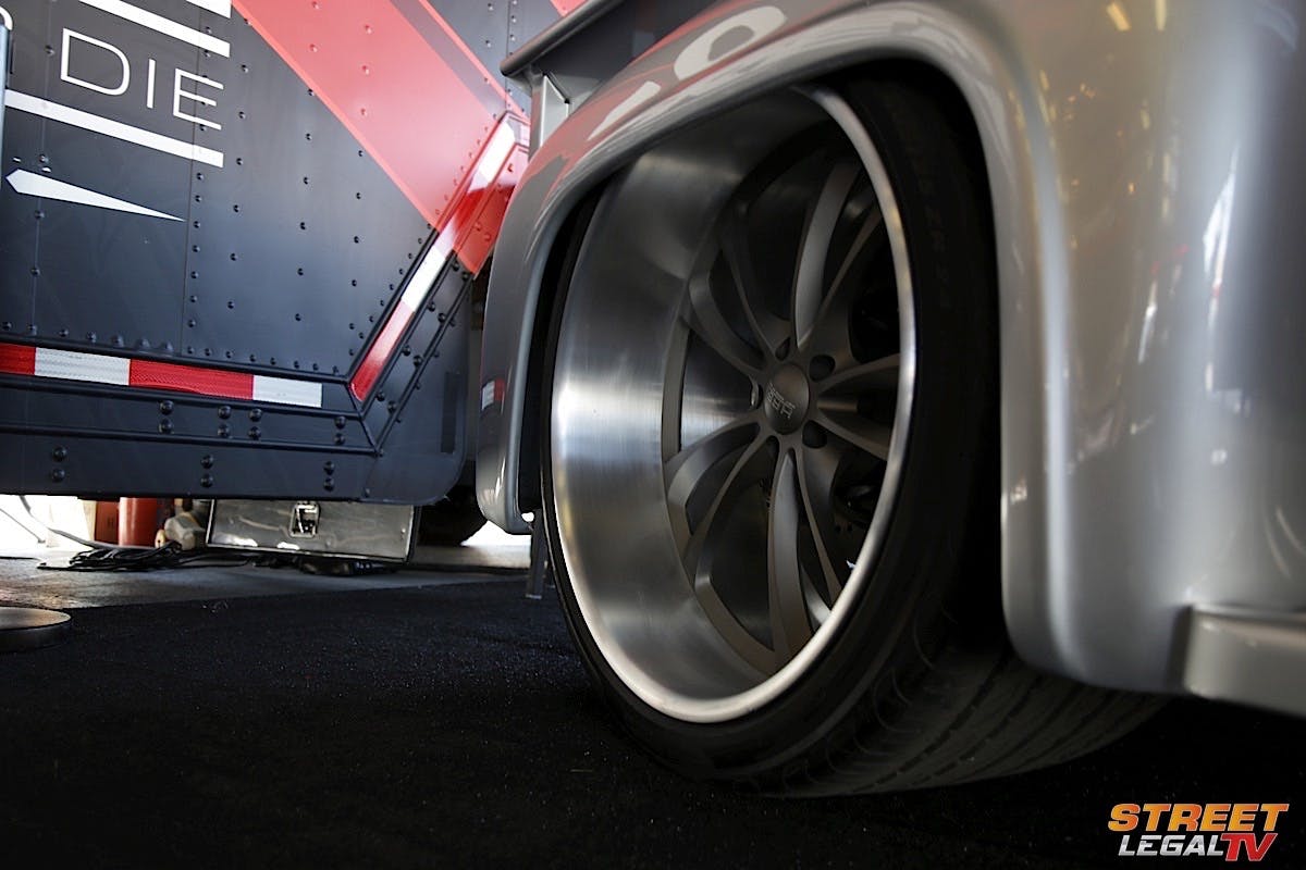 On display at the Speed Freak apparel booth, Punisher was built by North American Speed & Performance (NASP) over a period of 12 months. Speaking of the build, the Punisher has a NASP 2×4 boxed FAT TIRE chassis with independent front suspension.