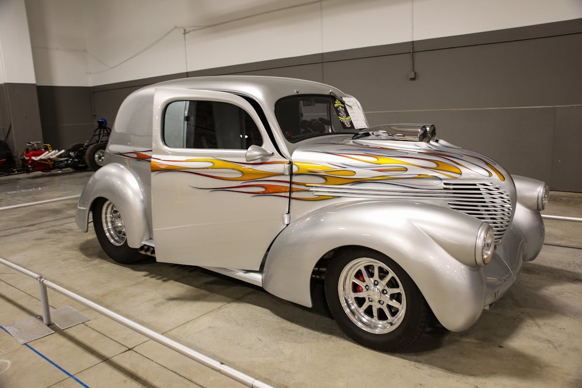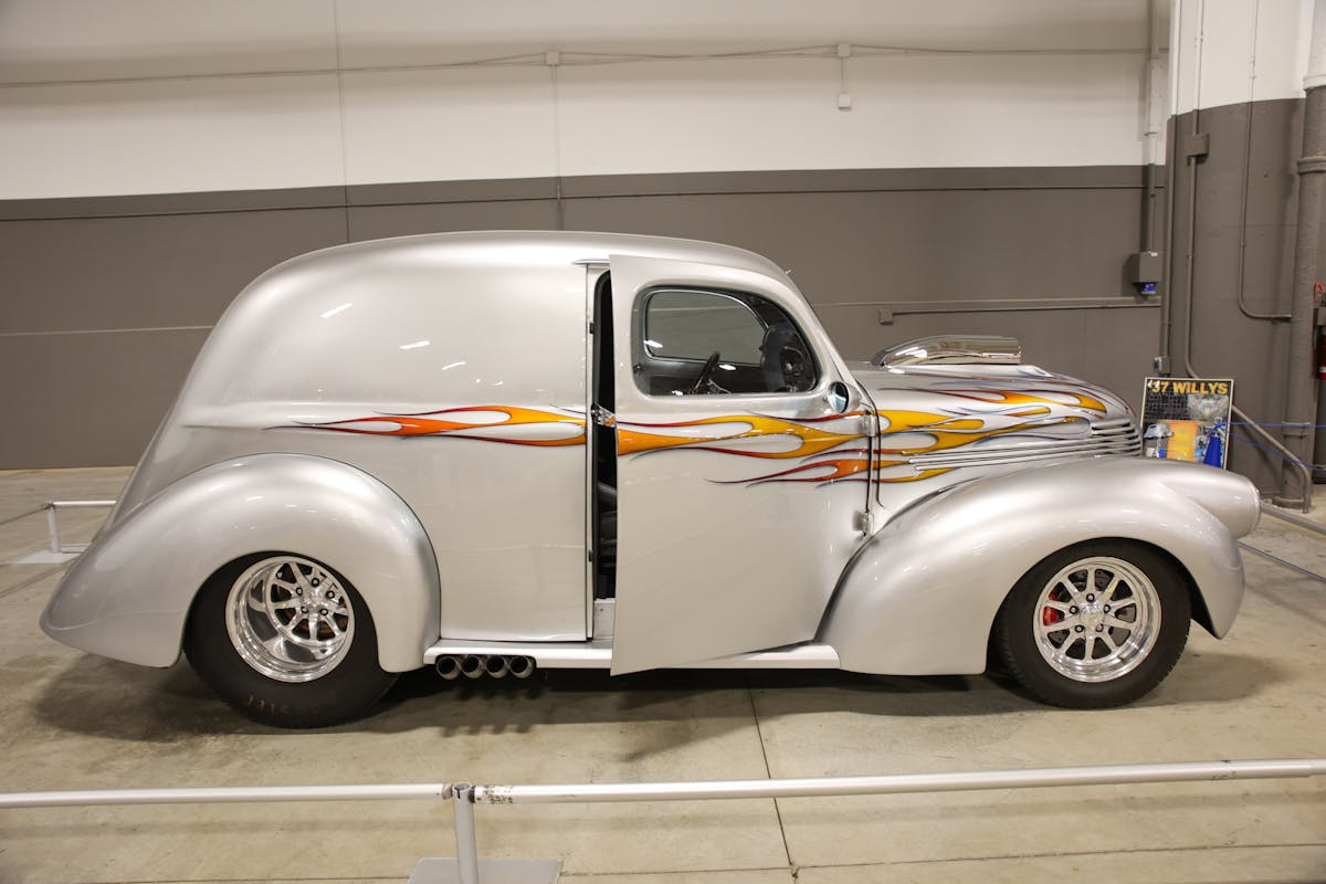 This all-steel 1937 Willys four-door sedan was converted to a sedan delivery model and boy does it look sharp. The Willys rides on a custom tube chassis that uses a Mustang II front end and custom 4-link suspension in the rear. For color, the body was spayed with a PPG Silver base coat before the custom crushed mirror mid-coat and flames were laid down. The Willys is powered by a 502 cubic-inch big block Chevy that’s topped off with an 8-71 Weiland supercharger.