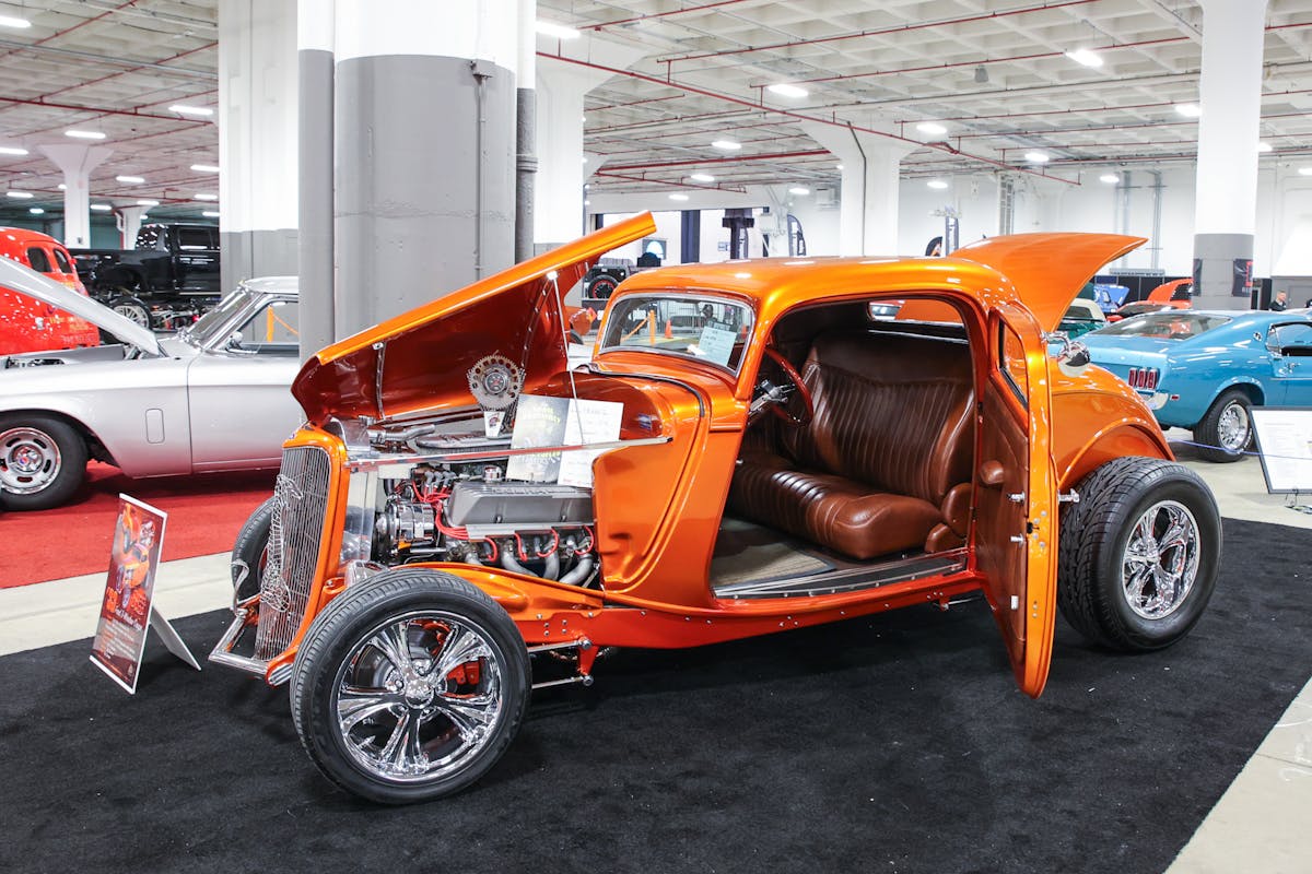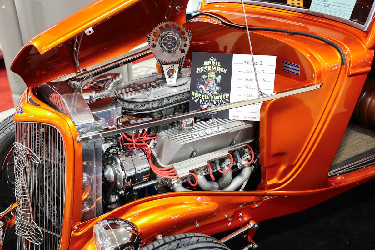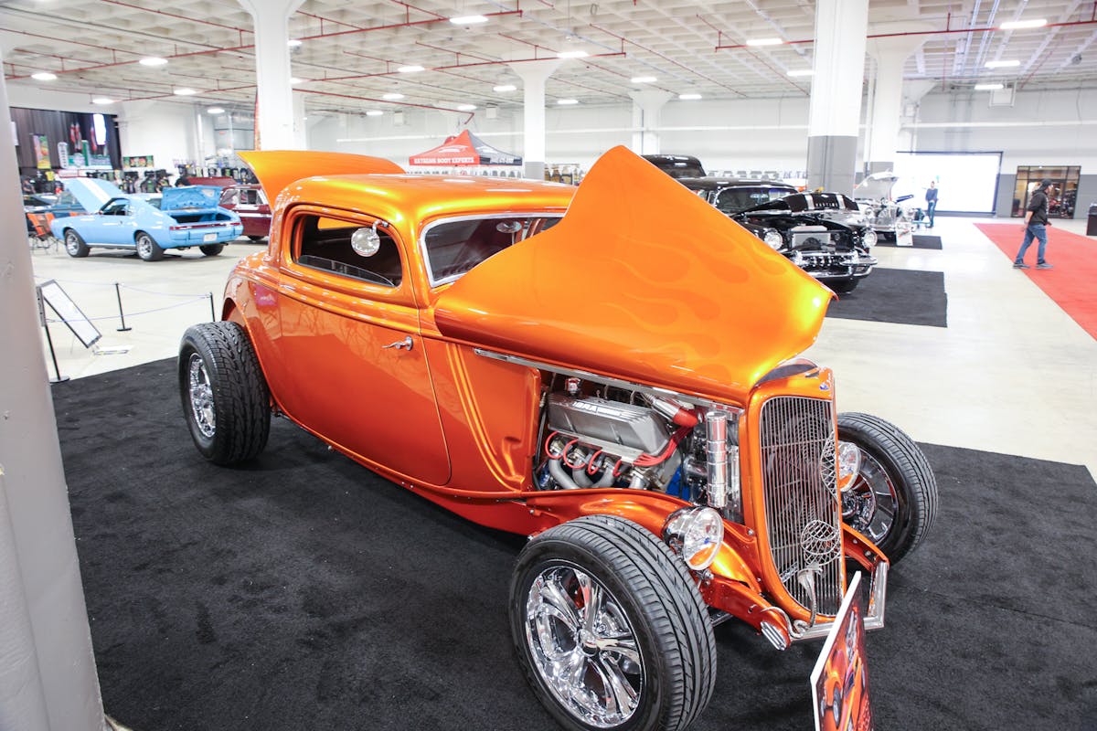 There’s nothing cooler than a hot rod that’s been built to be a rowdy ride. Lee Fritz built this 1933 Ford 3-Window coupe himself and it’s a wicked machine. A 445 cubic-inch Ford engine lives under the hood and has been matched to a C6 transmission. In the rear, Lee added a Ford 9” rearend that’s filled with 3.50 gears and Traction-Loc differential. T&T Custom sprayed the hot rod in a radical shade of orange for Lee. The interior of the Ford was done by Lee.