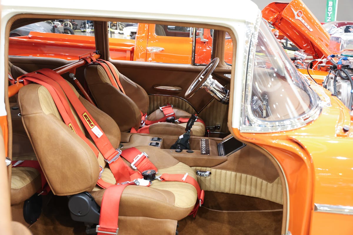 There’s nothing cooler than a hot rod that’s been built to be a rowdy ride. Lee Fritz built this 1933 Ford 3-Window coupe himself and it’s a wicked machine. A 445 cubic-inch Ford engine lives under the hood and has been matched to a C6 transmission. In the rear, Lee added a Ford 9” rearend that’s filled with 3.50 gears and Traction-Loc differential. T&T Custom sprayed the hot rod in a radical shade of orange for Lee. The interior of the Ford was done by Lee.