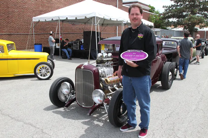 Since 2005, Goodguys has crowned their Hot Rod of the Year award here in Indy. This year’s field was stout from the start of competition Friday morning. We say competition because it’s just that. The cars are driven AND raced at the dragstrip. No cream puffs allowed here. The Goolsby guys had a fresh hemi powered deuce in the mix. Kevin and Garey Robert, two died in the wool “Ohio Look” hot rodders, had their pair of deuce roadsters vying for the win. Veteran rodder, Bruce Vath, chimed in with a stanced ’36 Ford coupe, and Rob Jowsay had not one, but two jet black, channeled and sinister Model A Tudor’s from his Autokraft Autobody stable in Fremont, Indiana.