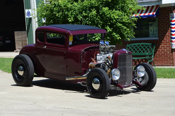 Painted PPG Manderin Maroon with black steel wheels, ’40 Ford hubcaps, finned drums, and a healthy dropped axle rake, the coupe plays on the heartstrings of traditional hot rod aficionados. The 4 1/2-inch chopped steel body looks right at home sitting atop a ’32 Ford frame.