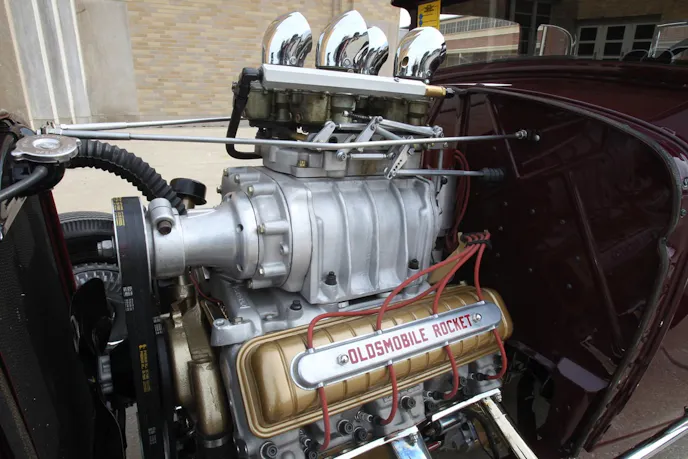 What really grabs your attention however, is the 371 ci blown Oldsmobile Rocket 88 engine, built in-house by Lombardi’s Ross Racing engines. It features a Dyer’s 4-71 blower atop a Cragar intake with 94-series carbs. With no hood or hood sides on the car, the motor just reaches out and demands attention. A Tremec T-5 transmission and Winter’s quick change rearend insure a sporty drive and spirited stop light sprints.