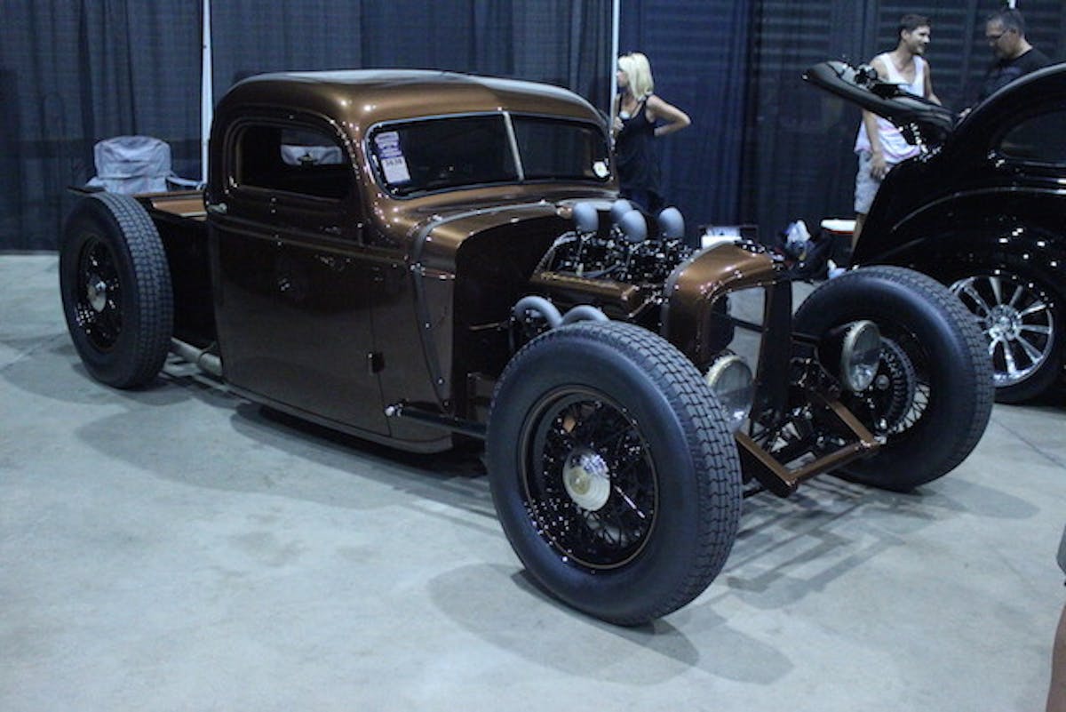 With a four and a half-inch chop and shaved cowl vents, Eldred customized the bed and hand-fabricated brass door handles and door trim. A 1935 Chevy grille shell was sectioned and ’34 Ford headlights added to the front. The tail lights are from a 1937 Chevy that are modified and fitted with custom brass bezels with Zephyr lenses. The entire truck is covered in Brass Monkey Bronze base and clear coat.