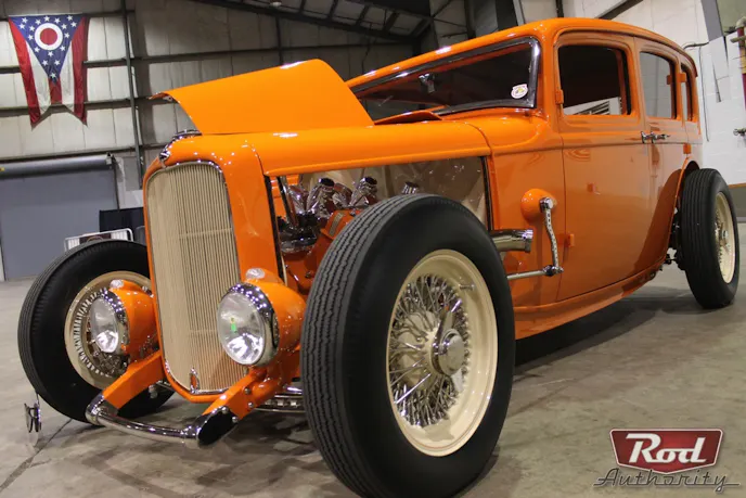 The roof is chopped 3.5-inches to give the street rod a more aggressive, but road-friendly aesthetic. 1940 Chevy front turn signals and ’36 Chevy headlights have been added for some custom flavor. The paint is a PPG Rat Roadster Green over Copperhead Orange.