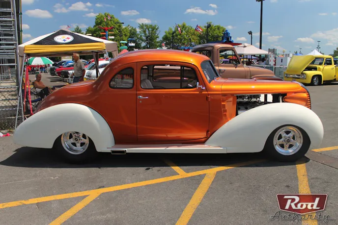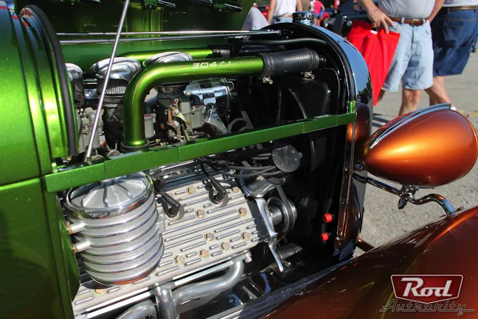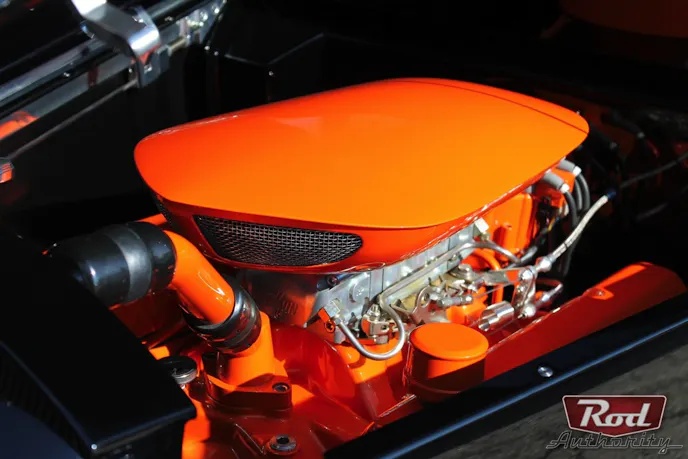 The roof is chopped 3.5-inches to give the street rod a more aggressive, but road-friendly aesthetic. 1940 Chevy front turn signals and ’36 Chevy headlights have been added for some custom flavor. The paint is a PPG Rat Roadster Green over Copperhead Orange.