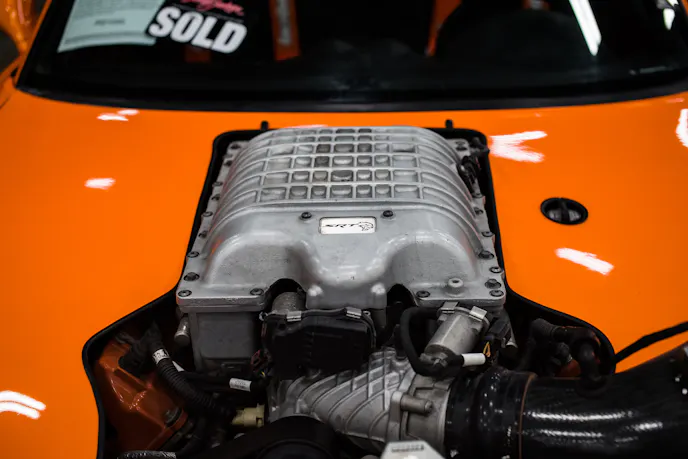 Unlike some sleeper cars, there’s no hiding the fact that this Miata is a monster. The body features an eye-catching Tangelo paint job, and the hood only covers about three-quarters of the 6.2-liter V8 Hellcat engine.