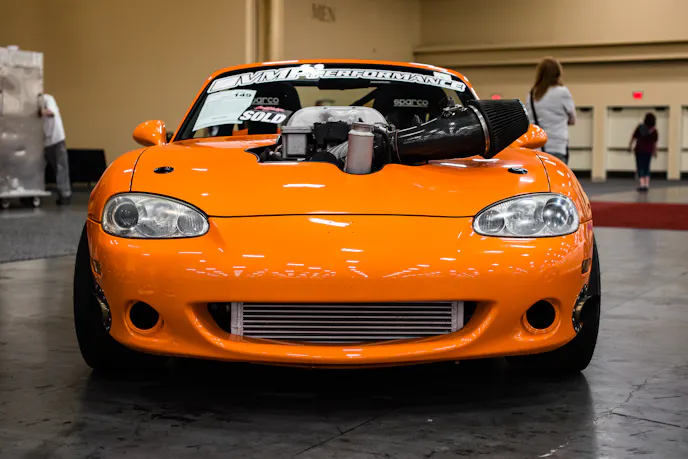 Unlike some sleeper cars, there’s no hiding the fact that this Miata is a monster. The body features an eye-catching Tangelo paint job, and the hood only covers about three-quarters of the 6.2-liter V8 Hellcat engine.