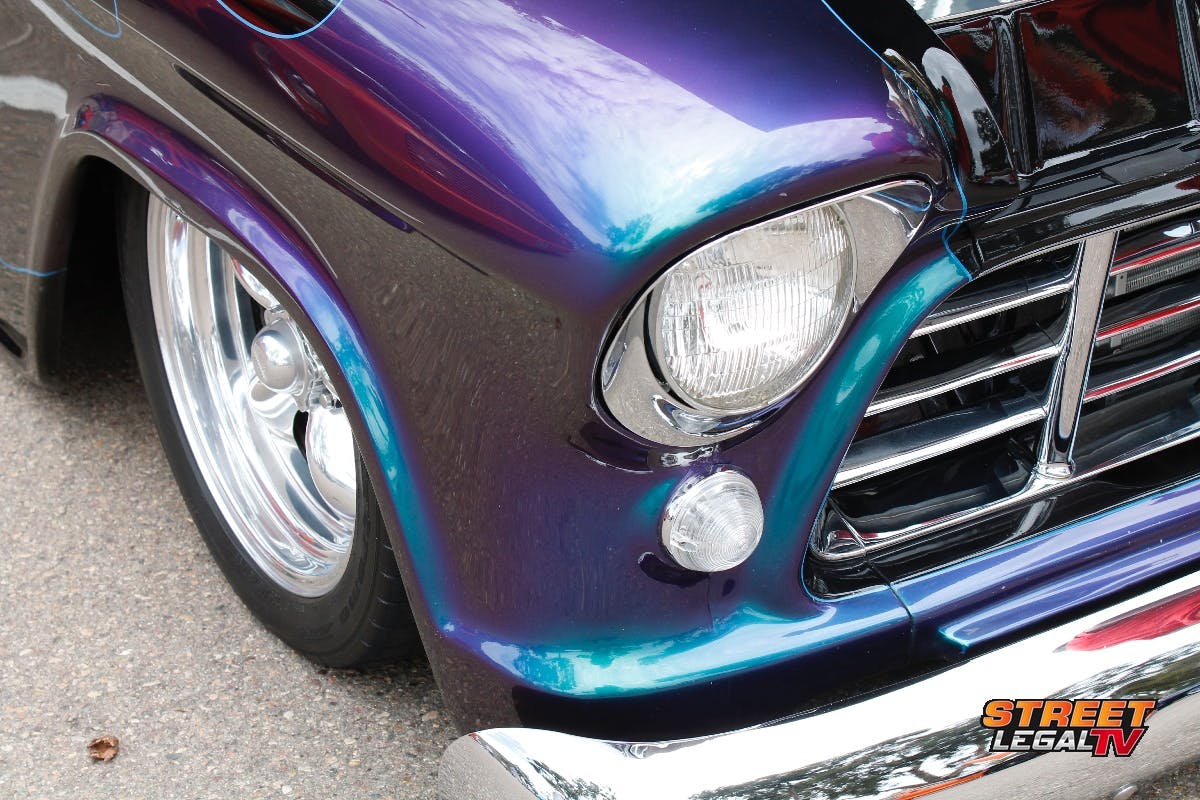 MCSD-AACS128There were lots of great Fords at the show, but this 1953 F-100 belonging to Dwayne Richardson was our hands down favorite. Under the bright orange hood was a 1957 Dodge 335 cubic inch Hemi backed by a Richmond 5-speed transmission. The truck was built for performance and luxury, with power windows and doors, air conditioning, power steering, and power brakes. But don’t let those luxuries fool you, the rear fenders were widened two inches to accommodate the wide 275/60R17 rubber mounted on American Racing Torque Thrust II wheels. Disc brakes help bring this Hemi-powered truck to a stop, witih a Kugel IFS and a No-Limit 4-link rear suspension.