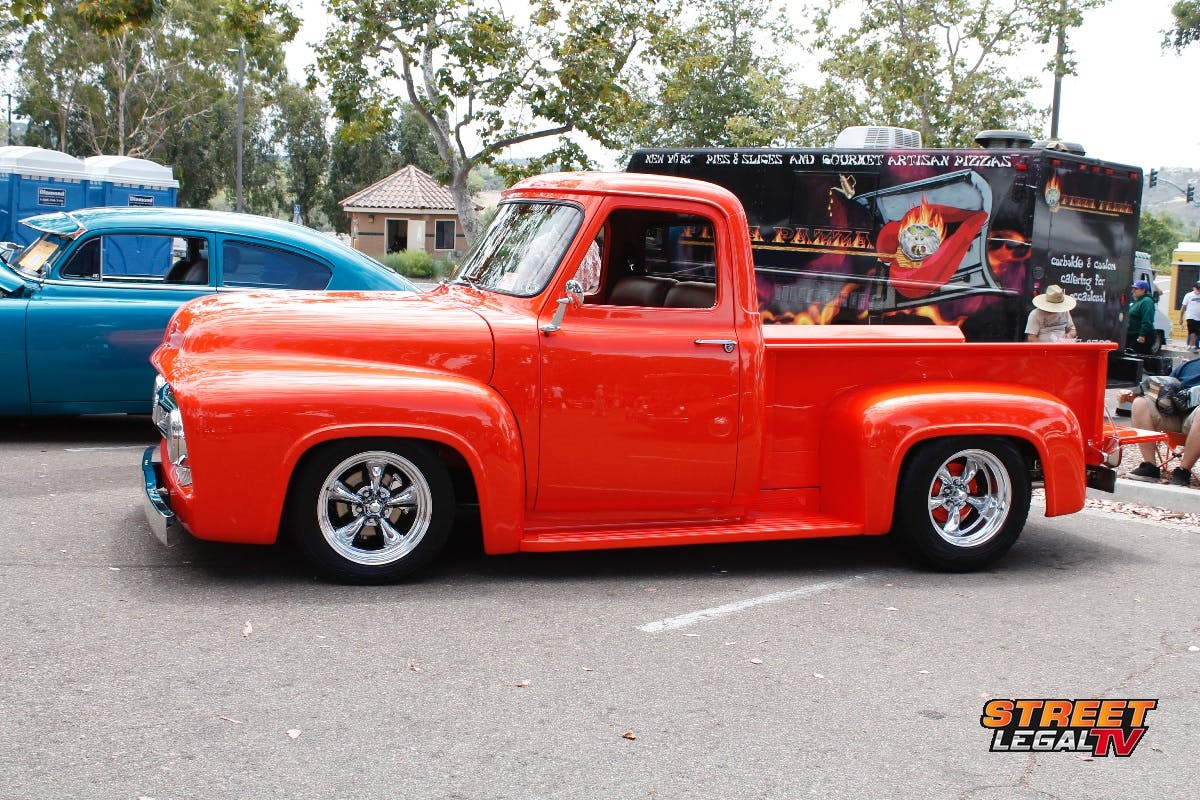MCSD-AACS128There were lots of great Fords at the show, but this 1953 F-100 belonging to Dwayne Richardson was our hands down favorite. Under the bright orange hood was a 1957 Dodge 335 cubic inch Hemi backed by a Richmond 5-speed transmission. The truck was built for performance and luxury, with power windows and doors, air conditioning, power steering, and power brakes. But don’t let those luxuries fool you, the rear fenders were widened two inches to accommodate the wide 275/60R17 rubber mounted on American Racing Torque Thrust II wheels. Disc brakes help bring this Hemi-powered truck to a stop, witih a Kugel IFS and a No-Limit 4-link rear suspension.