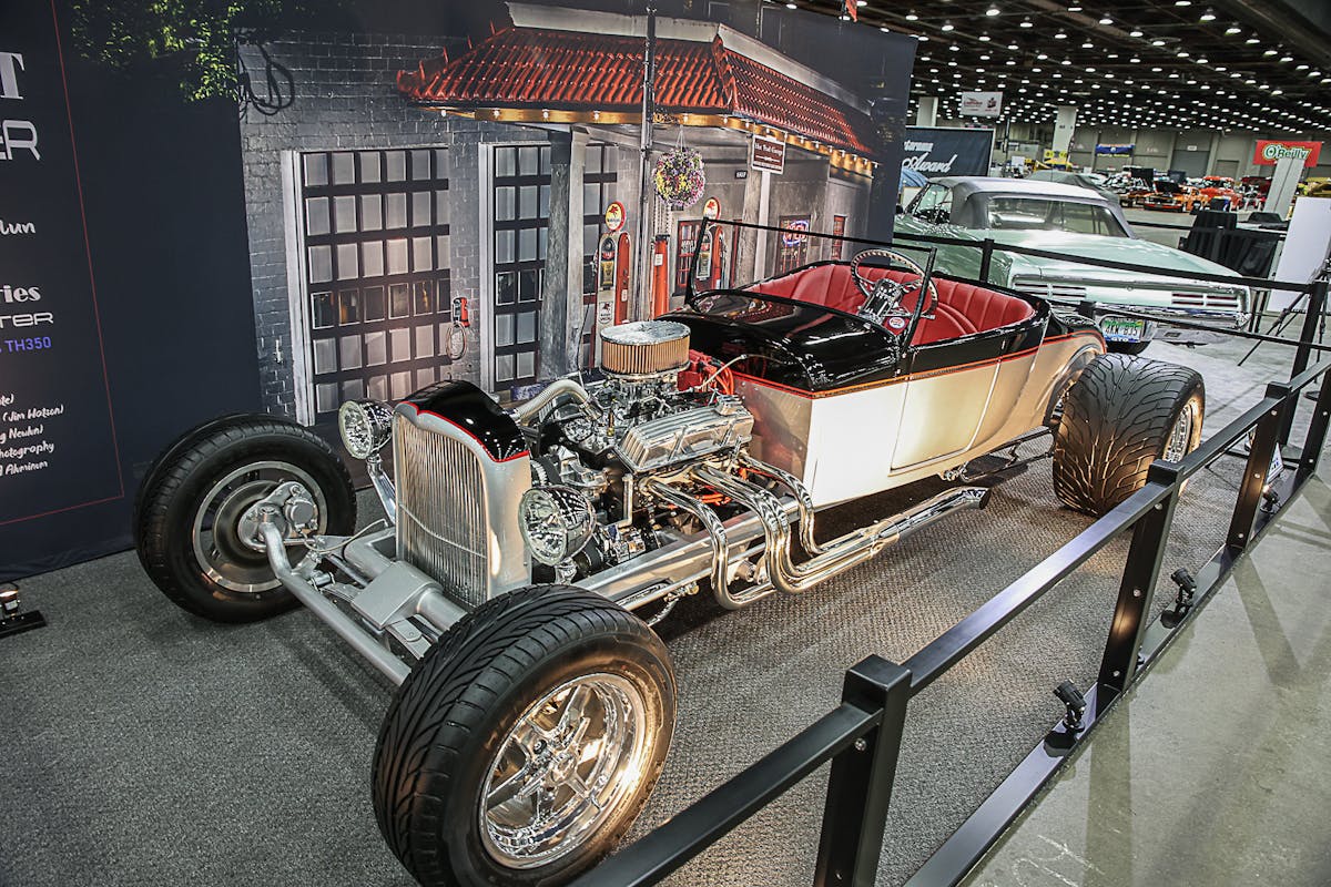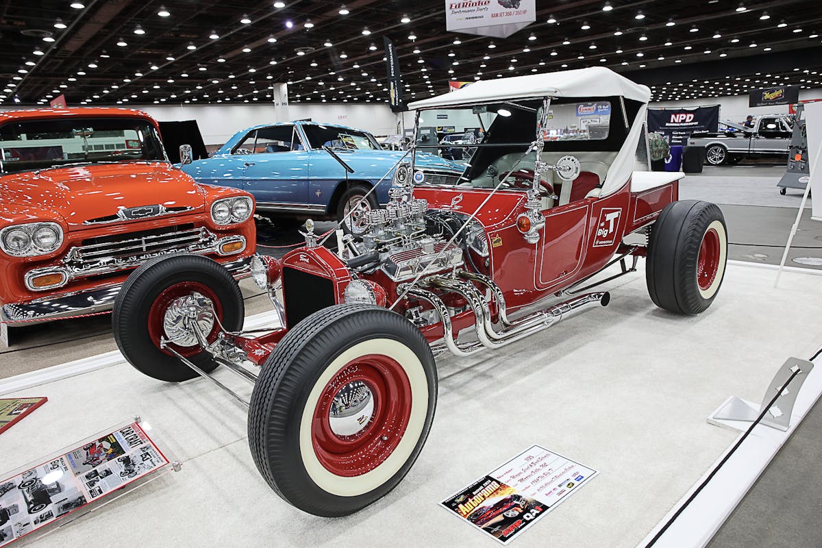 The Big “T” is an iconic model car that was produced by Monogram. Wayne Jesel built a full-size version of the Big “T” and gets to drive it. Waye’s car is based on a Model A frame that has stepped rails, a chrome 1937 Ford tubular front axle, and a Halibrand quick change rearend. The body of his 1924 roadster has been combined with a shortened Model A pickup bed. The interior consists of bucket seats with rolled and pleated upholstery. A built 283 cubic-inch engine that’s backed by a 1937 Buick transmission helps to move this real-life Big “T” down the road.