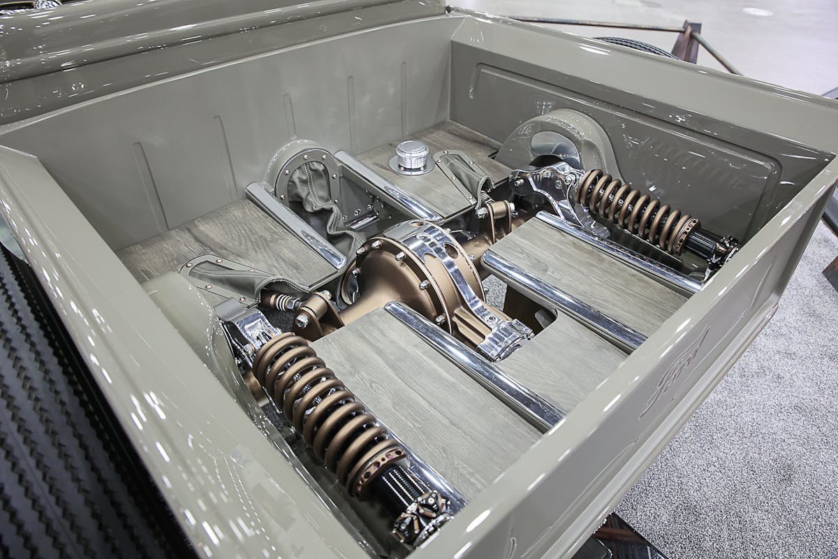 The Brookville body rides on a custom chassis and features a bed that’s been shortened three inches, along with custom bed rails. A custom hue of “Blown Head Gasket Gray” was mixed and sprayed on the roadster by Nichols. Alumicraft built the custom headlight bezels, firewall, and grill. The wheels were designed by Nichols, and VOS Upholstery took care of the interior.