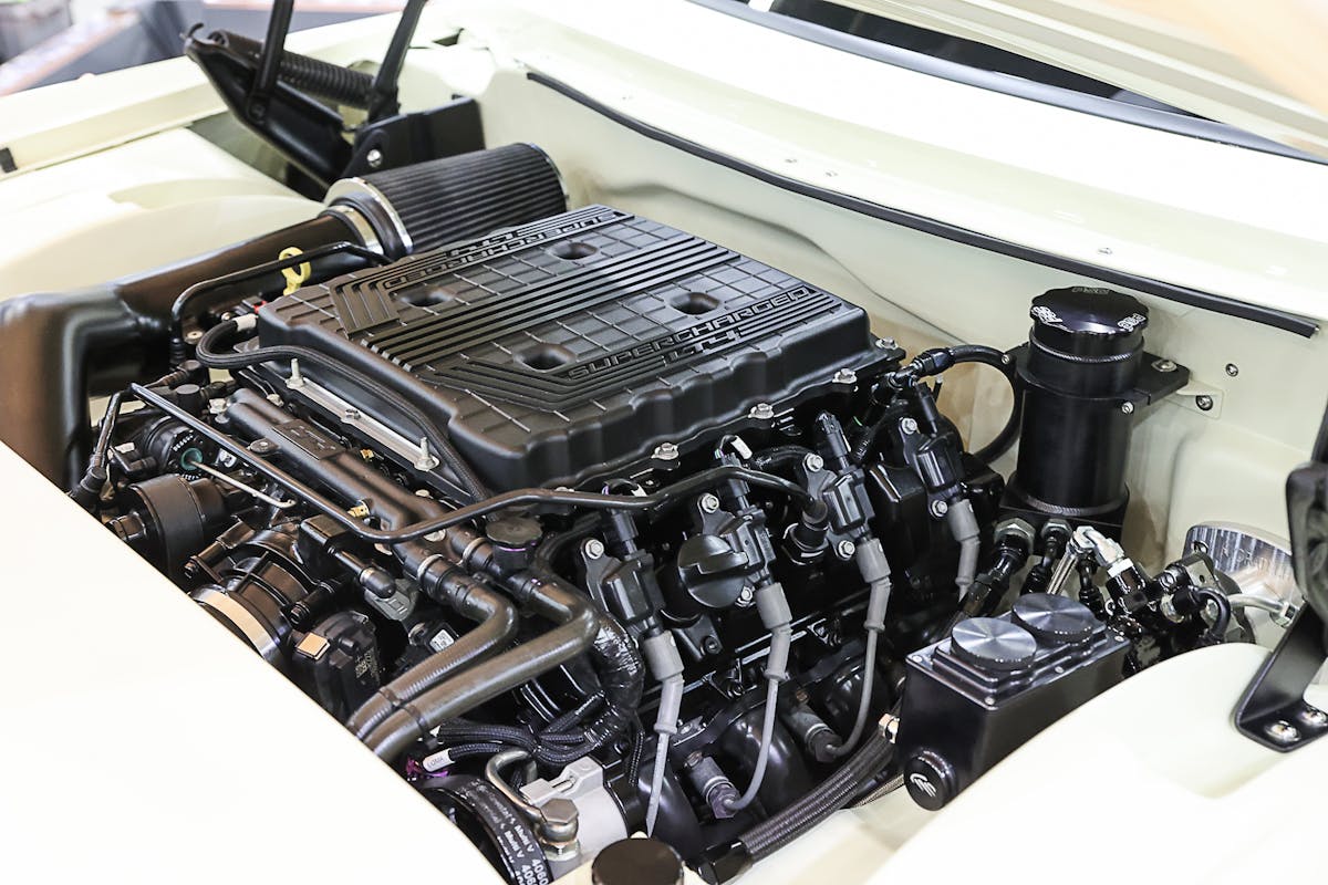 The 1967 Camaro that US 12 Speed and Custom built for Rocky Trozell has a subtle, but powerful look to it. The Red Devine paint works well with the matte bronze finish on the one-off Billet Specialties wheels. There’s plenty of Anvil Auto custom carbon fiber parts to be found all over the Camaro. The car is powered by a 525 horsepower 6.2-liter LS engine that’s backed by a TREMEC transmission. Interiors by Ed crafted an outstanding space inside the Camaro that features products from TMI.