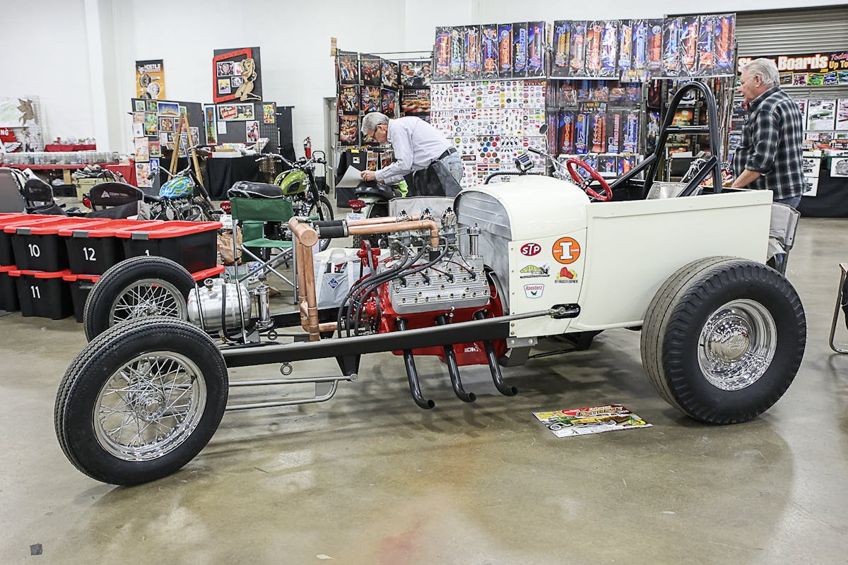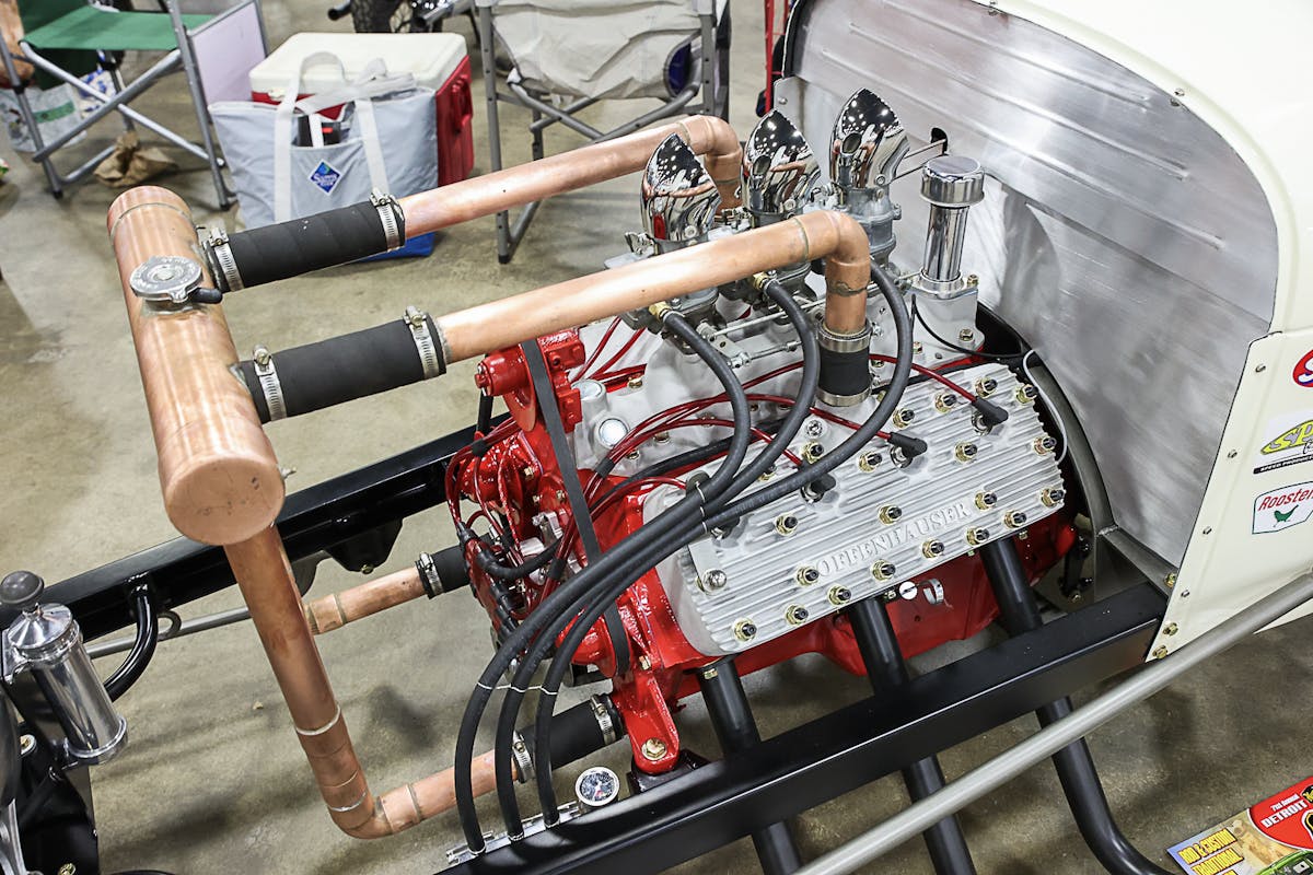 The Big “T” is an iconic model car that was produced by Monogram. Wayne Jesel built a full-size version of the Big “T” and gets to drive it. Waye’s car is based on a Model A frame that has stepped rails, a chrome 1937 Ford tubular front axle, and a Halibrand quick change rearend. The body of his 1924 roadster has been combined with a shortened Model A pickup bed. The interior consists of bucket seats with rolled and pleated upholstery. A built 283 cubic-inch engine that’s backed by a 1937 Buick transmission helps to move this real-life Big “T” down the road.