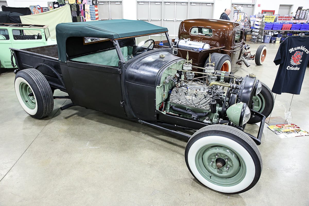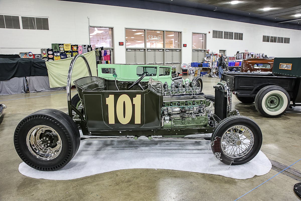 The Big “T” is an iconic model car that was produced by Monogram. Wayne Jesel built a full-size version of the Big “T” and gets to drive it. Waye’s car is based on a Model A frame that has stepped rails, a chrome 1937 Ford tubular front axle, and a Halibrand quick change rearend. The body of his 1924 roadster has been combined with a shortened Model A pickup bed. The interior consists of bucket seats with rolled and pleated upholstery. A built 283 cubic-inch engine that’s backed by a 1937 Buick transmission helps to move this real-life Big “T” down the road.