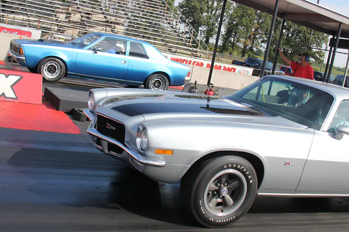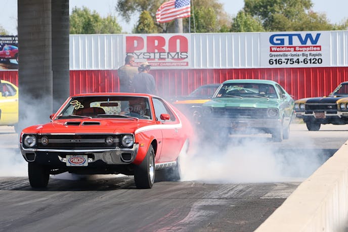 Hot small-blocks were out in force, and here Ty Taccone’s 1970 Z28 (top left) was putting in the work against Larry Weymouth’s 1971 Hornet SC in qualifying. Both cars are well in the 12s with Larry posting a best or 12.964/110.25, while Ty set a personal best of 12.665/108.63. Joe Pinsoeault heats the hides in qualifying. This little AMX was the quickest AMC on the property, posting a best of 12.764 at 108.47 in the shootouts. Powered by a 390/325 4-speed with 3.73 gears, Joe took home the win against Kent Gardner’s 1971 Buick GS.